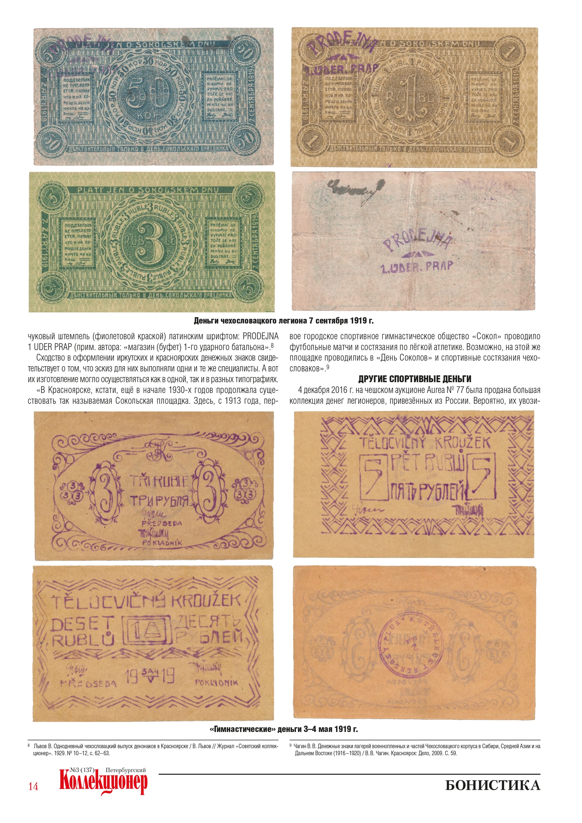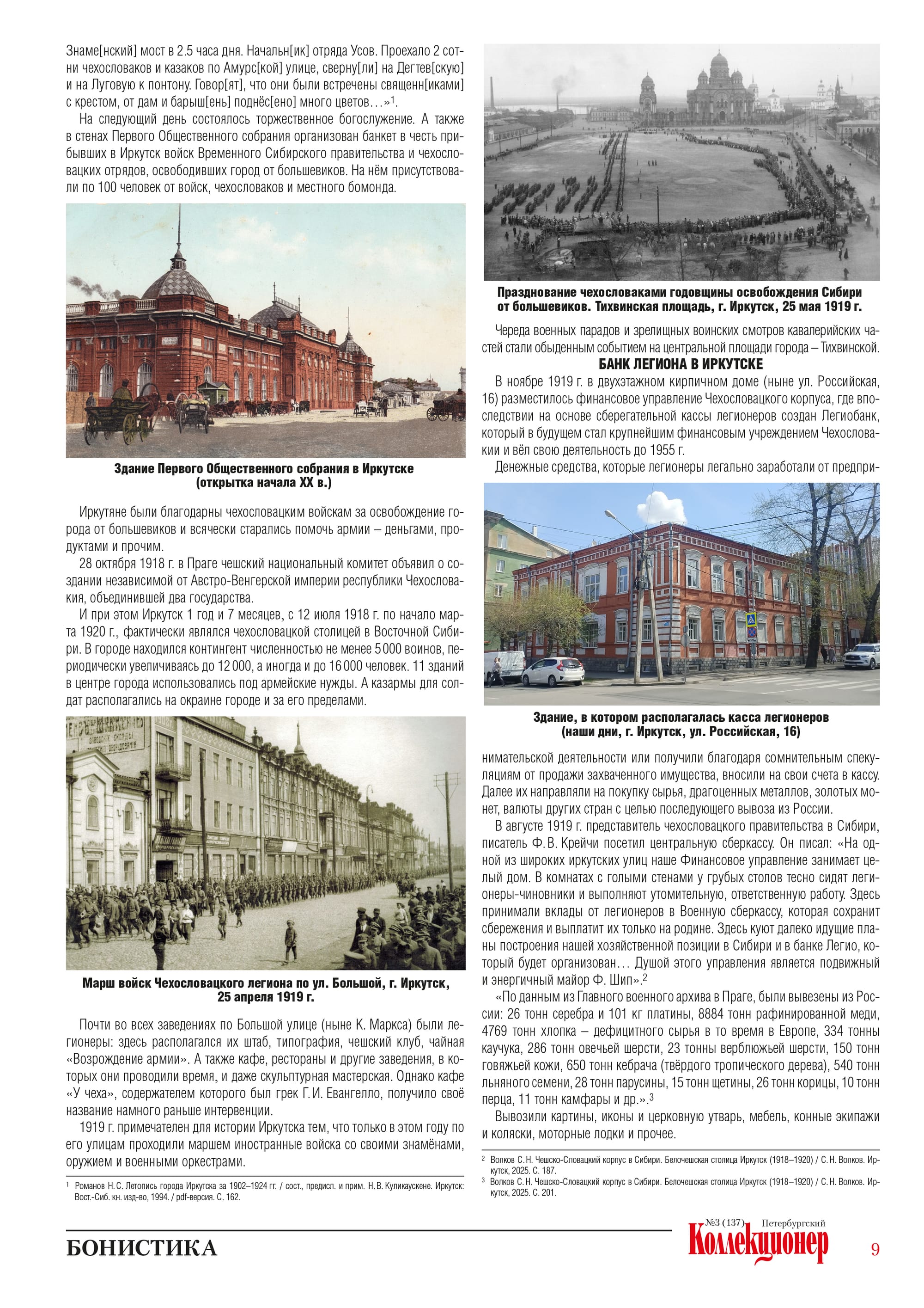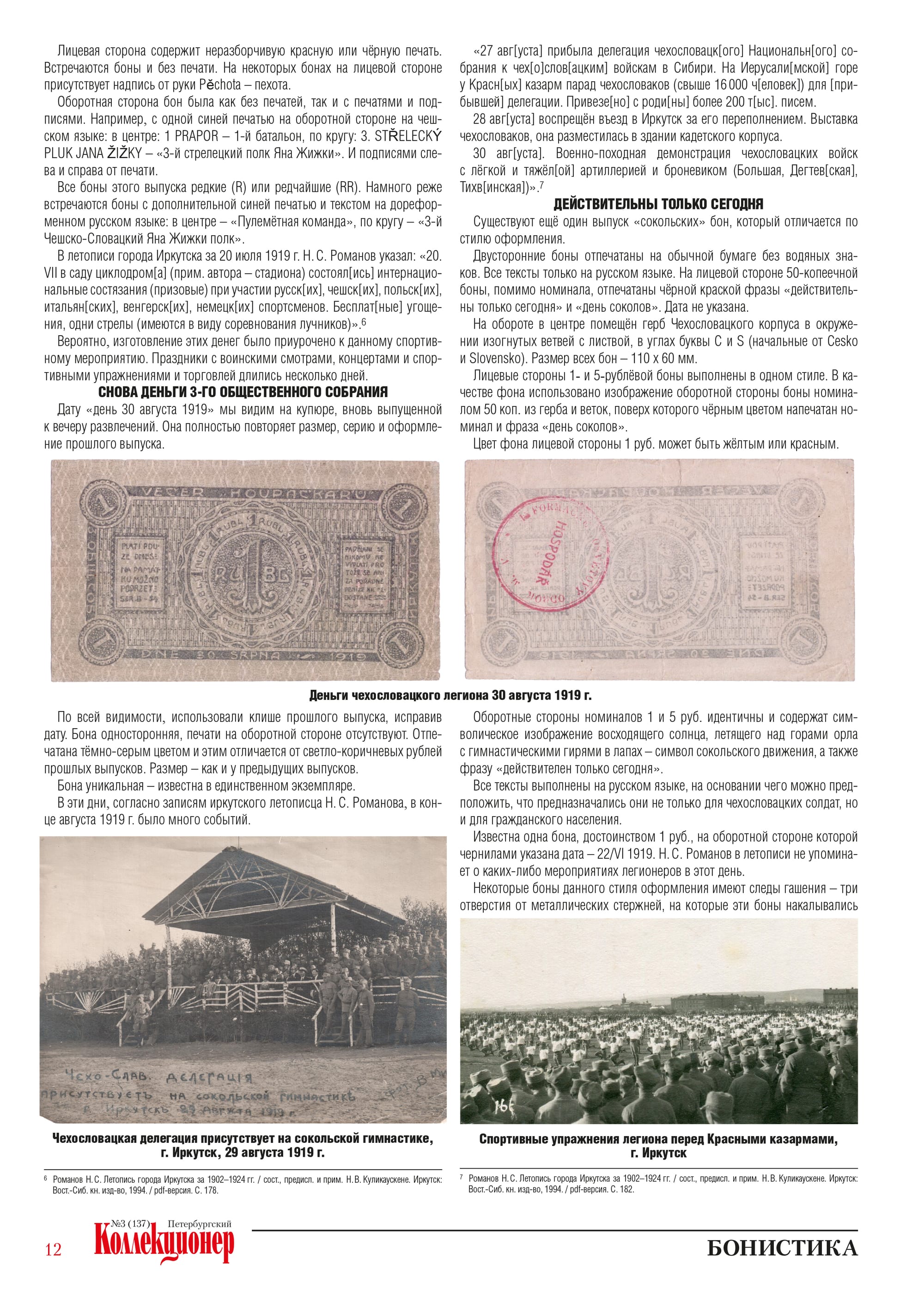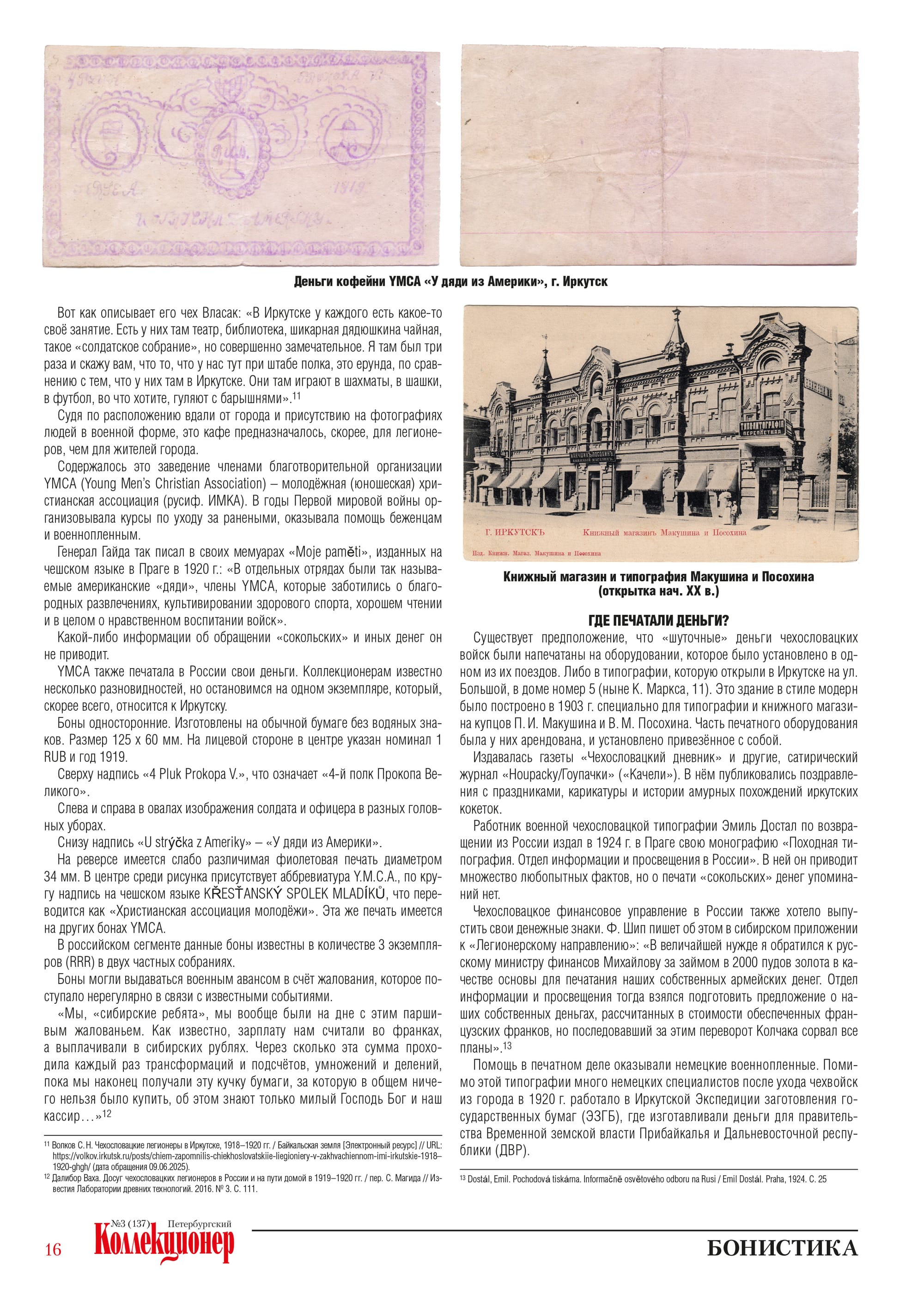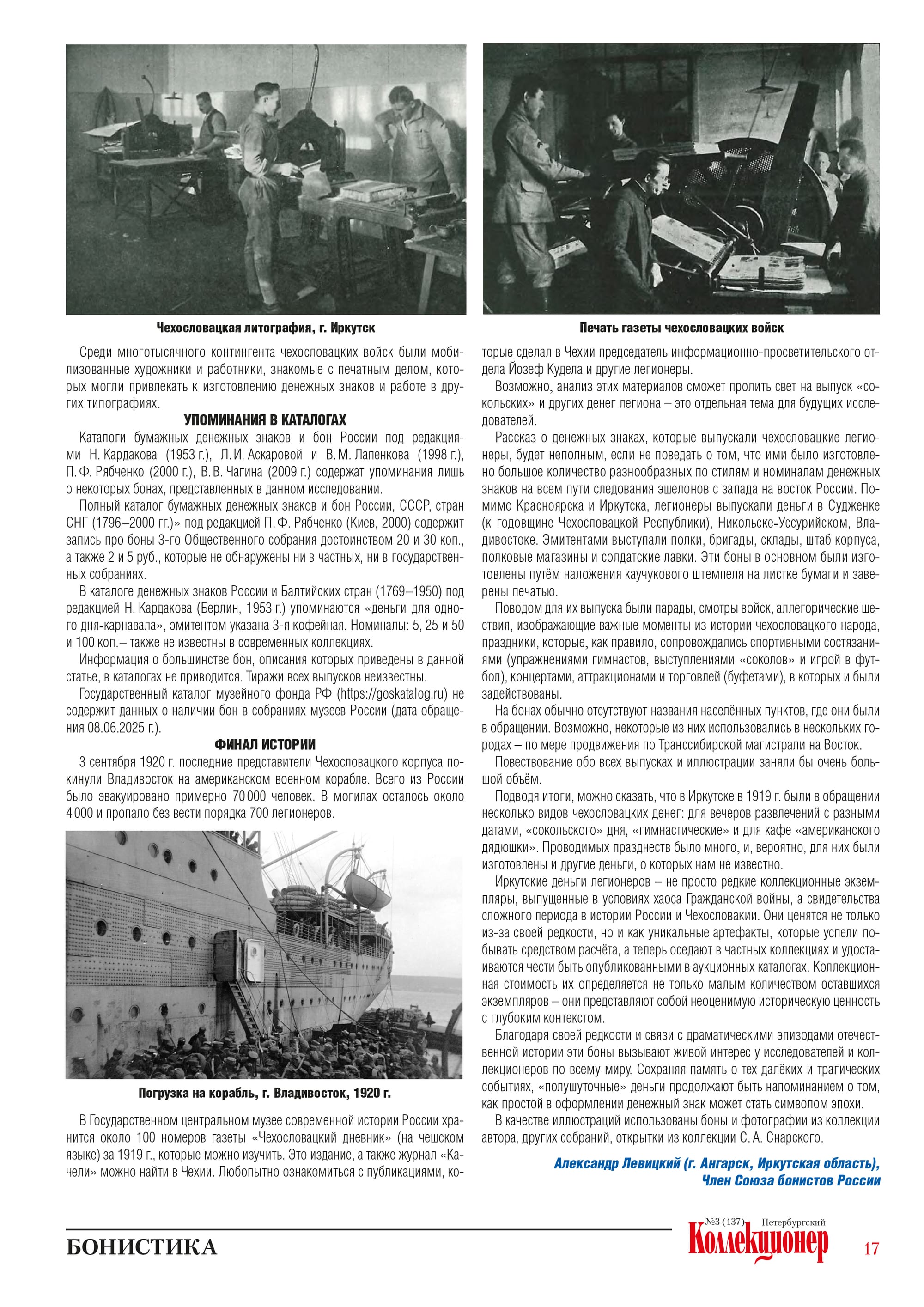В сентябрьском номере журнала Коллекционер петербургский №3 (137) 2025 г. опубликована содержательная статья члена Союза бонистов России Александра Левицкого "Деньги чехословацких легионеров" по малоизученной теме: "Исследование, описание и изображения бон, выпущенных чехословацкими легионерами в Иркутске в 1919 г." На фото ниже 10 стр. опубликованной статьи в журнале, а ниже полная версия публикации на 56 стр. Другие статьи этого автора можно посмотреть на этом сайте по следующей ссылке.