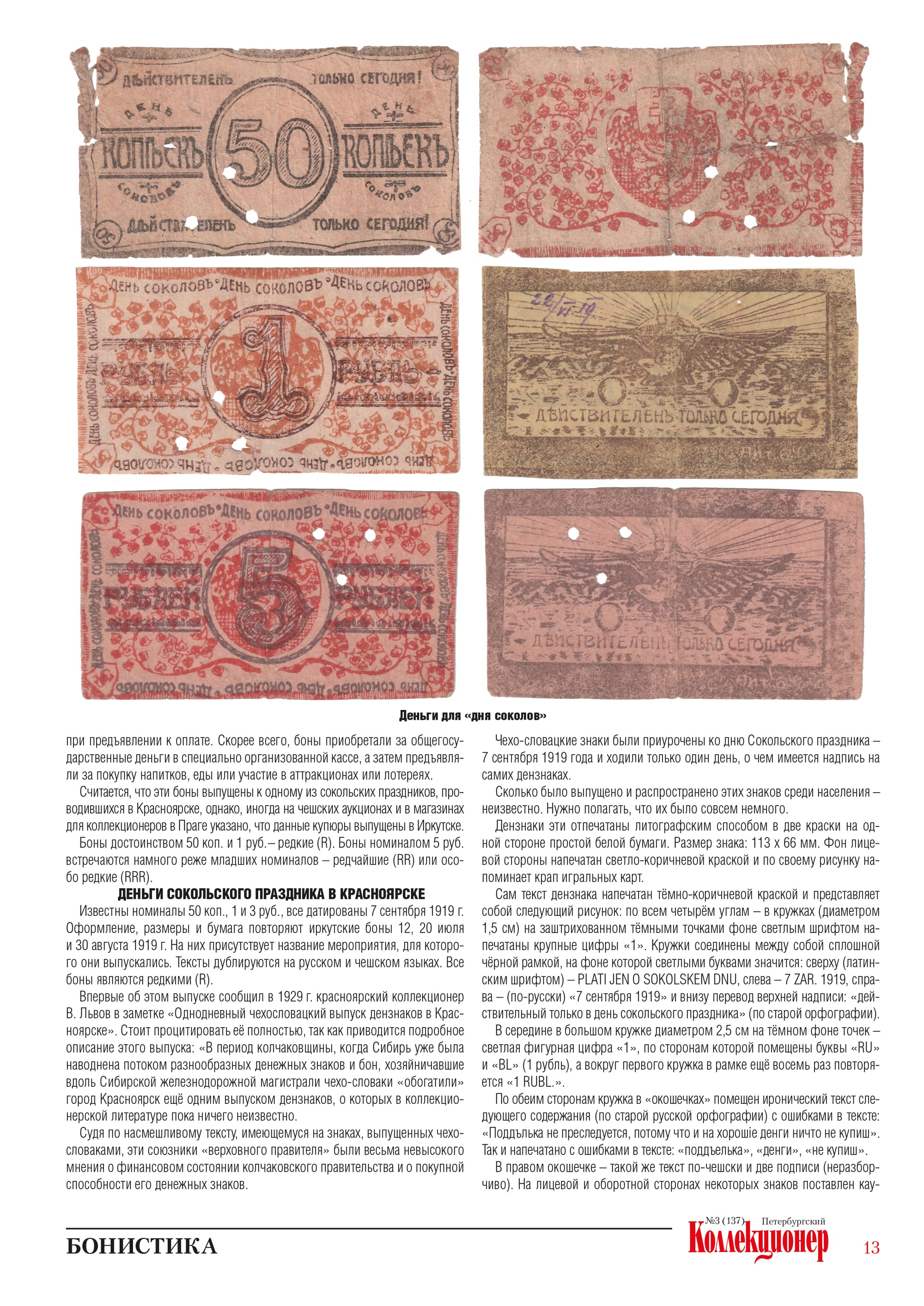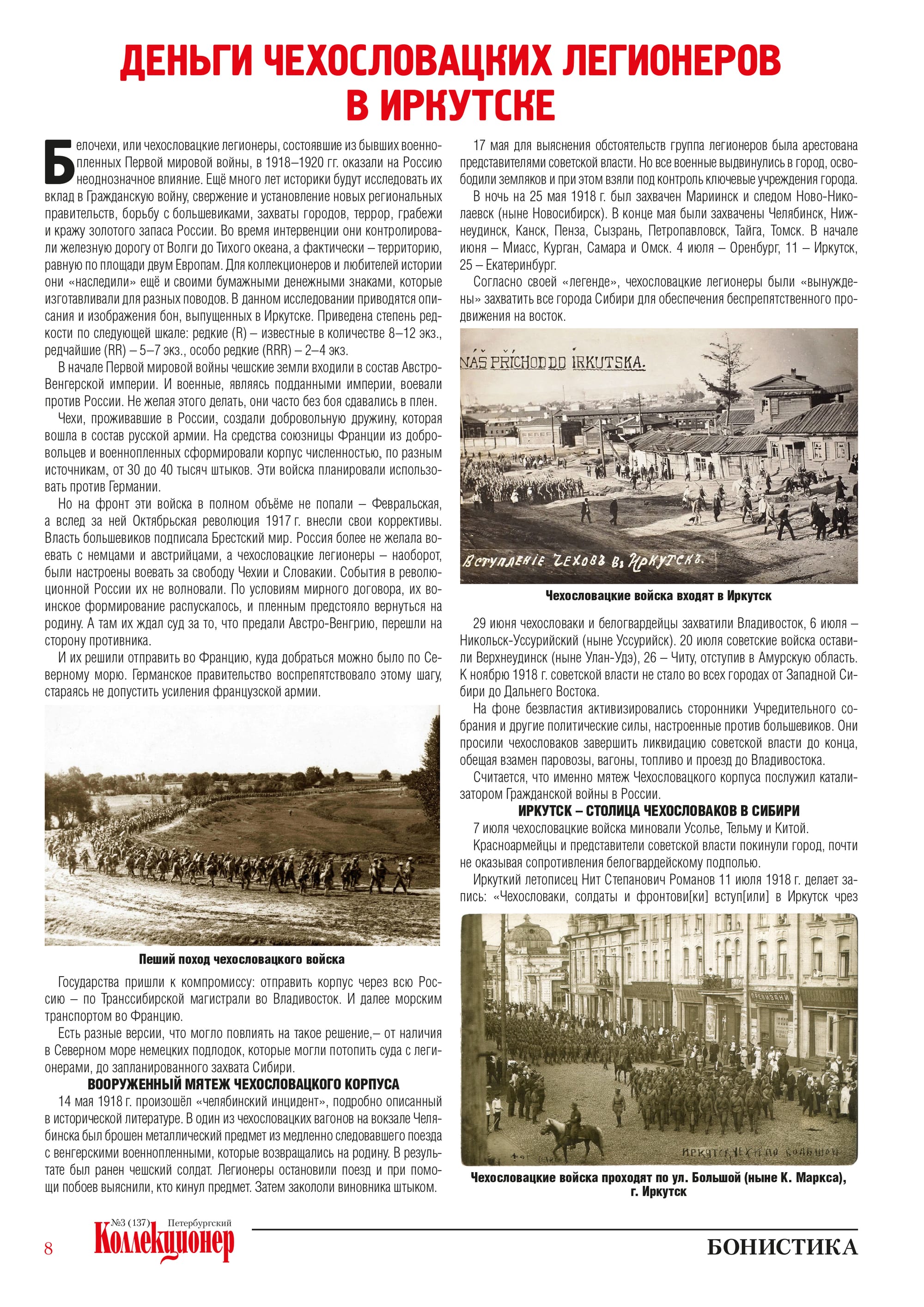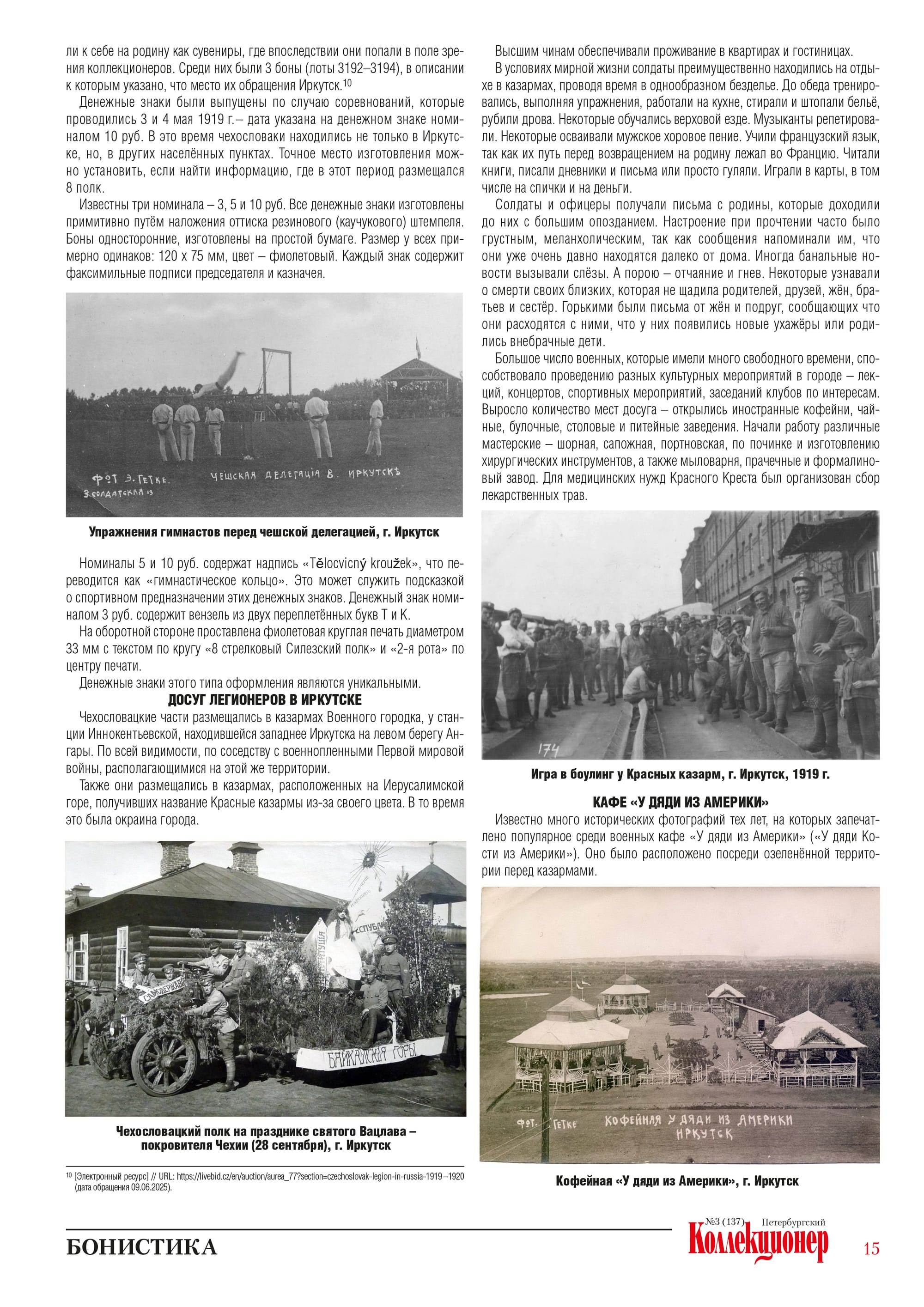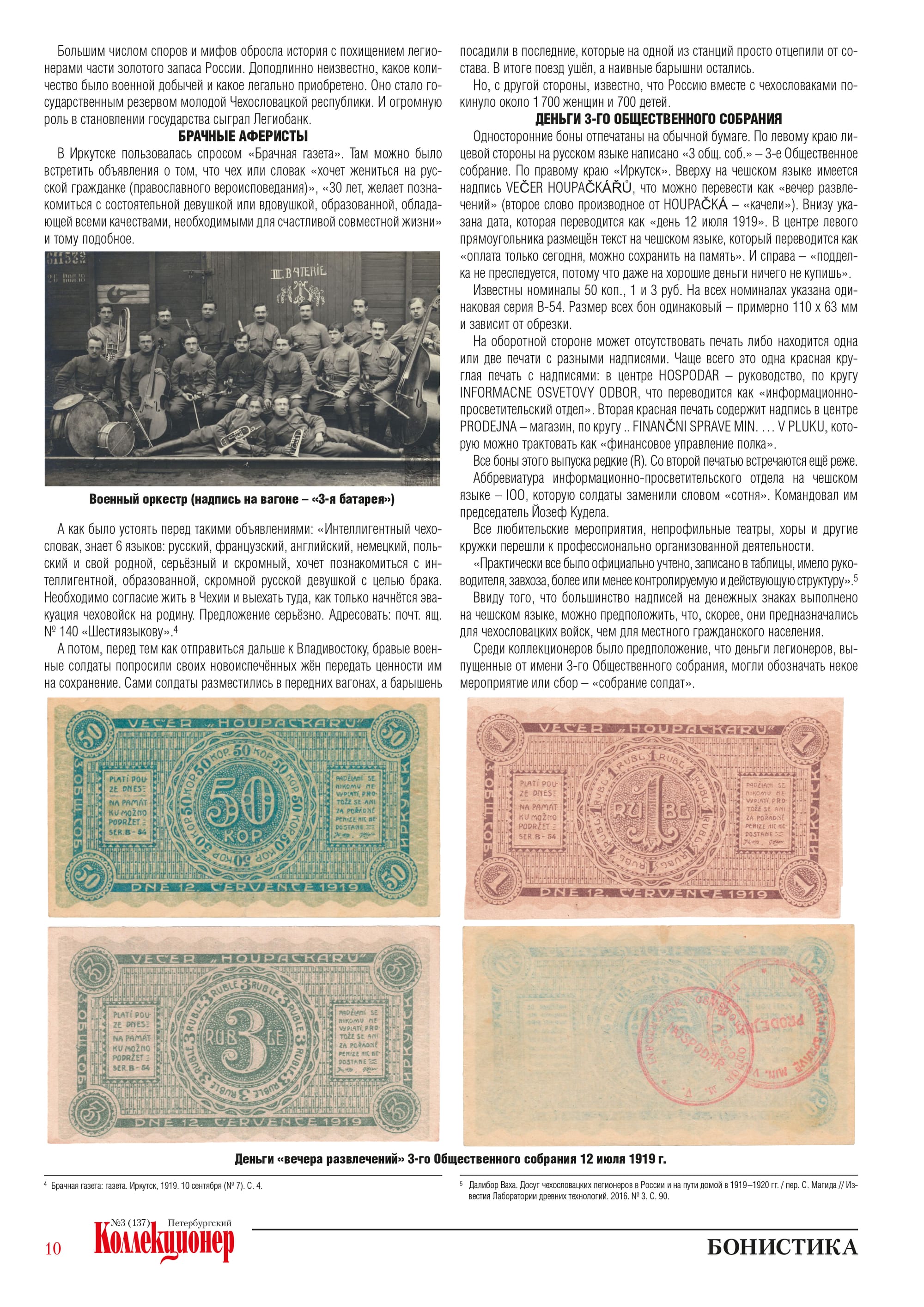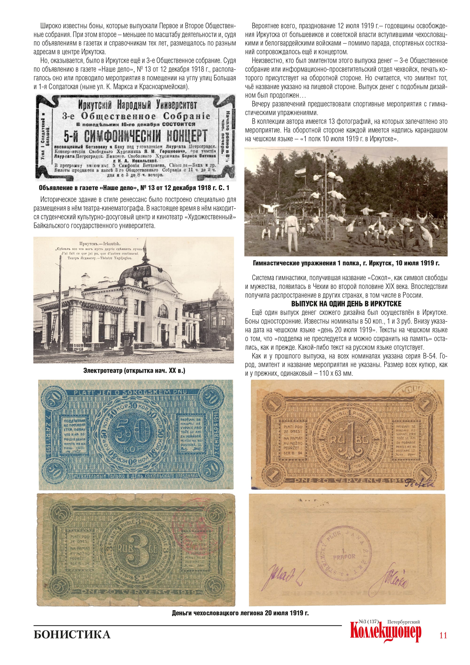 В сентябрьском номере журнала Коллекционер петербургский №3 (137) 2025 г. опубликована содержательная статья члена Союза бонистов России Александра Левицкого "Деньги чехословацких легионеров" по малоизученной теме: "Исследование, описание и изображения бон, выпущенных чехословацкими легионерами в Иркутске в 1919 г." На фото ниже 10 стр. опубликованной статьи в журнале, а ниже полная версия публикации на 56 стр. Другие статьи этого автора можно посмотреть на этом сайте по следующей ссылке.