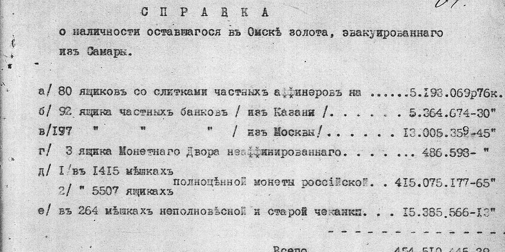 Спорный материал: во 2 части, ошибочно сообщается: " О хищении чехословацкими легионерами зимой 1919/1920 года целого вагона с золотом (514 ящиков)". Согласно актам в каждом вагоне было максимум 200-250 ящиков, 514 ящиков в вагон не поместятся, + известно только об одной краже 13 ящиков в Зиме. 520 ящиков в каждом вагоне значится в актах при их отправке обратно из Иркутска в Казань - это американские большегрузные вагоны, а в Иркутск прибыли пульмановские вагоны меньшей вместительности, максимум на 200-250 ящиков. + в ночь с 11 на 12 января 1920 года более 33 тонн «сибирского золота» были похищены чехословацкими легионерами на станции Зима". Однако загруженный в вагон стандартный ящик с золотом весил примерно 57 кг каждый, в каждом вагоне согласно актам находилось по 200-250 ящиков, т.е максимум 14 т. 33 тонны это более 2 вагонов, которые должны были быть пустыми после хищения, однако из актов известно, что все вагоны пришли в Иркутск полностью заполненными, за исключением одного, из которого было похищено 13 ящиков, общим весом 750 кг. Откуда снова фантастическая и совершенно не обоснованная цифра хищения 33 тонн золота чешско-словацкими легионерами?
