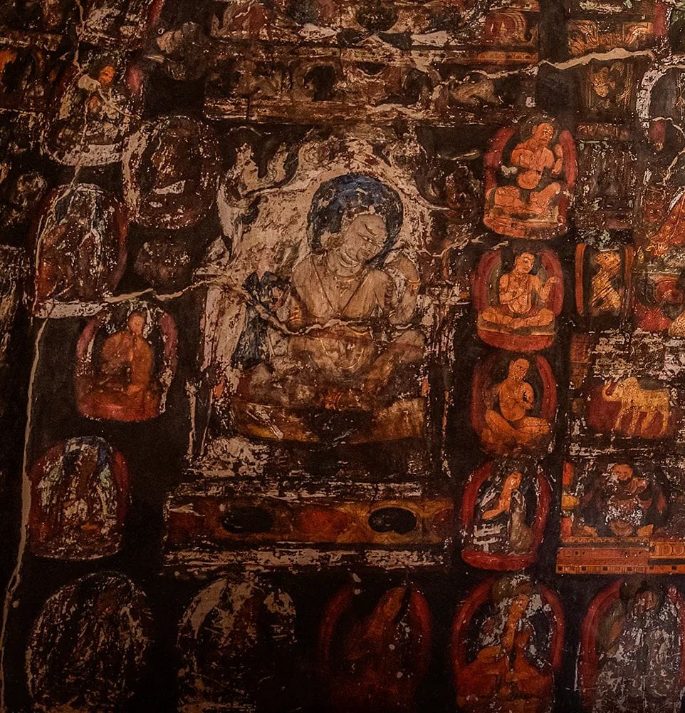 Подпись фото: Среди них сохранились лишь несколько из первоначальных 12 глиняных статуй в Пещере 2. Осталось всего несколько фрагментов, но форма пещеры и фрески относительно хорошо сохранились, особенно Это трехмерная структура с четырьмя концентрическими цилиндрами, расположенными друг над другом на вершине пещеры[1]. Царство дхармы на фреске на потолке пещеры Донгга № 2. эта мандала принадлежит Ваджрному миру. Фреска на потолке пещеры Донгга № 2 показывает положения Будд в мандале Царства Дхармы. Вера Манджушри и паниндийская культура, популярные в регионе, главный приоритет технических исследований Из таблицы 2 видно, что фресковые надписи часто являются прямыми отрывками. Направление пещер во второй зоне меняется с севера на юг, с востока на запад, с небольшим U-образным распределением. Всего здесь 145 пещер. Третья область начинается от дна долины, поворачивая на запад до самого западного конца руин Пиянг, и насчитывает в общей сложности 247 пещер.