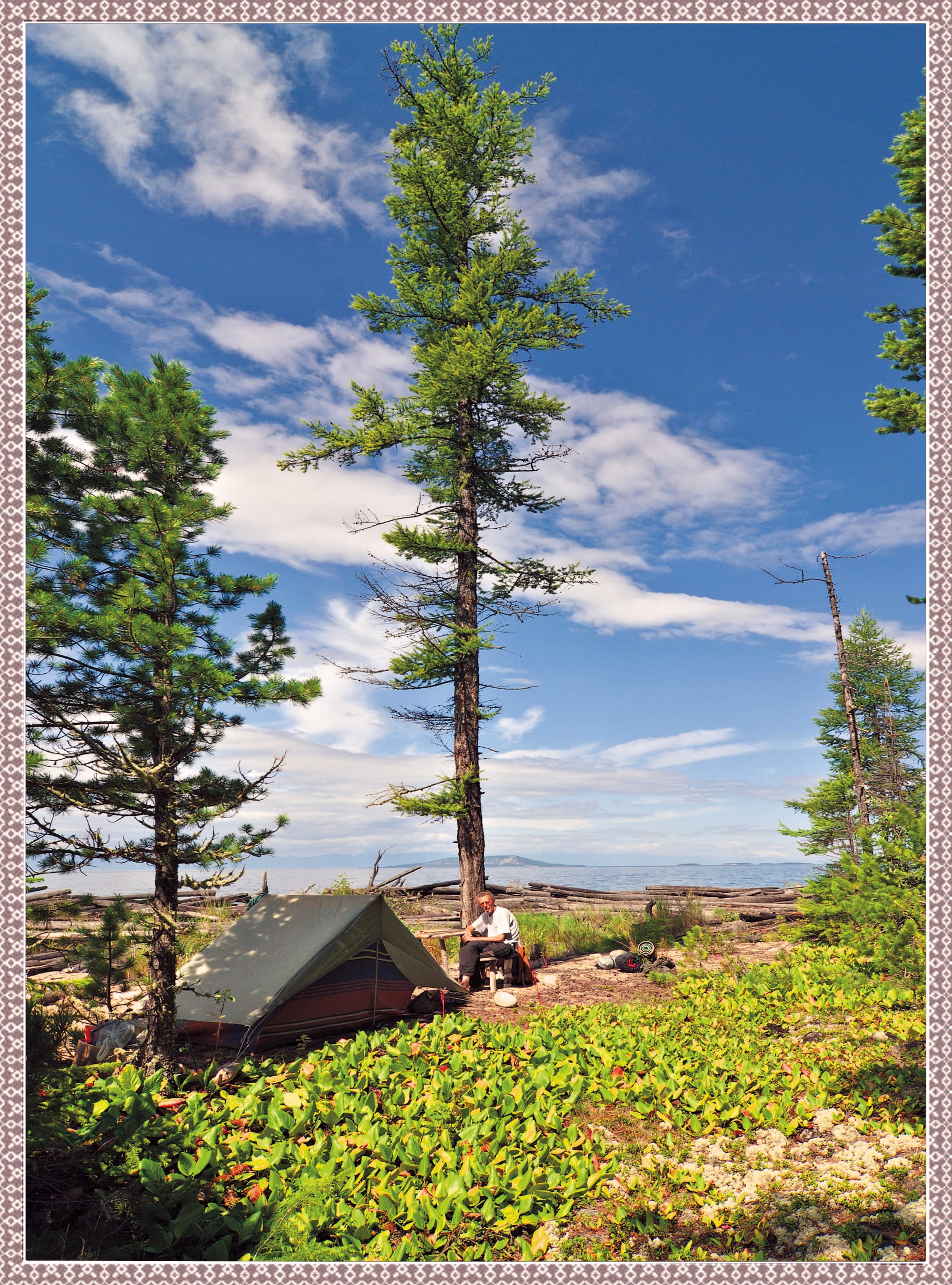 Цветение бадана. Справа: иркутский фотограф А. Князев на бивуаке
