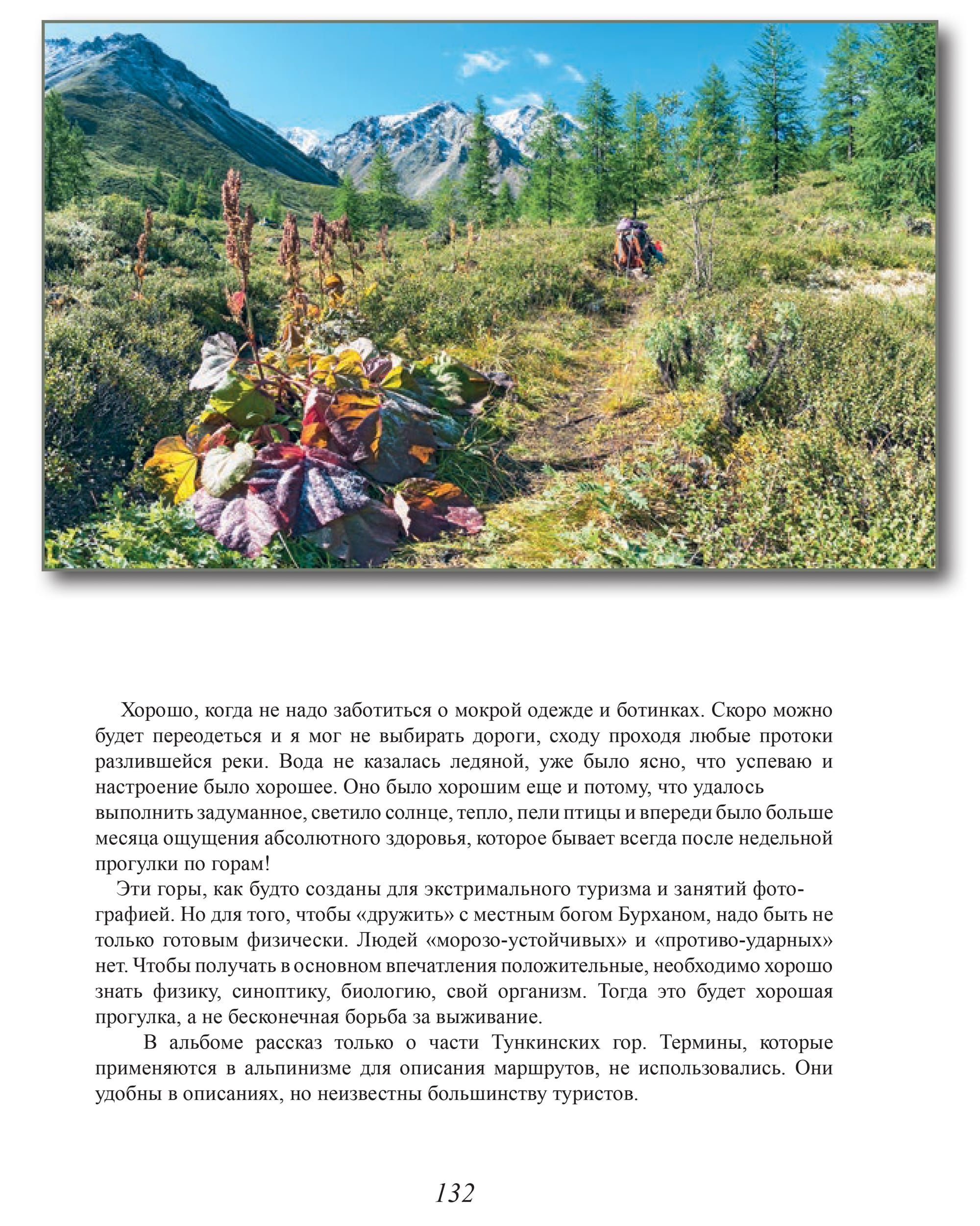 Интересных маршрутов, хорошо известных, немало, но если встать в любом месте известного маршрута и наугад ткнуть пальцем в любом направлении, то можно получить свой, неповторимый маршрут. Здесь есть вершины, долины и перевалы, где вообще не бывает людей. Здесь вопрос не в том, чтобы найти какой-нибудь особый, интересный маршрут, а в том, чтобы жизни хватило уви деть все это изобилие. Этот альбом – рассказ в художественных фотографиях о небольшой части Тункинских гольцов. Это горные массивы Мунку-Сардык и Пограничник. Фотографии делались с высоких вершин зи мой и летом. Просматривая альбом, можно изучить заранее все возможные маршруты в этих горах.