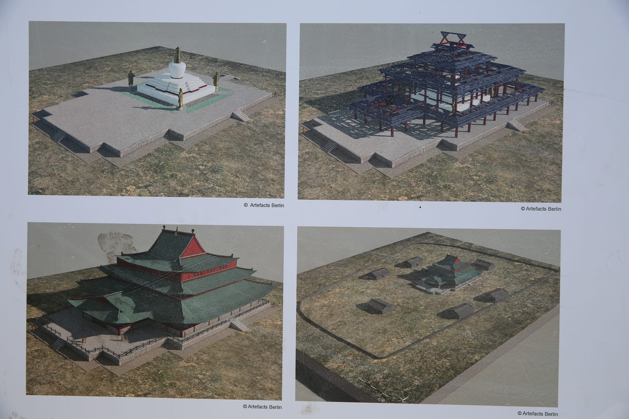 В отличие от дворцовой гипотезы, храмовая гипотеза в целом последовательна. Слой и структурные свидетельства, но прежде всего сами находки, говорят сами за себя: по их мнению, это многократно обновлявшееся или перестраиваемое зальное сооружение с почти исключительно буддийской обстановкой, включая остатки росписей, крупнофигурных глиняных скульптур (кат. № 128 и далее) и рельефов (кат. № 111–113), которые встречаются только в храмах или залах монастырских собраний. Хотя Киселёв упоминал львов и драконов как типичные мотивы для дворцовой плитки, буддийские терракоты фасадов или крыш (кат. № 122 и далее) теперь можно ясно сопоставить. Дворец, особенно описанный Рубруком, вряд ли был бы украшен ни лотосовыми тронами, ни буддами или бодхисаттвами. Рубрук, который, как показывает его маршрут, не упускал возможности осудить «идолопоклонство» и «идольские изображения» в Каракоруме, не мог не заметить или не оставить без внимания буддийские статуи и «идолопоклоннические» настенные росписи во дворце. Каракорумская надпись 1346 года описывает «Павильон [храм] Вознесения [инициала] Юань» (Синью-аньгэ) как семинефное квадратное сооружение: «Что касается первого этажа [...], четыре стороны образуют комнаты, каждая с семью нишами. Вокруг них были размещены статуи различных будд [...], в полном соответствии с указаниями сутр». В центре храмового павильона стояла ступа, и храм, как и дворец, был «окружён [...] сплошной стеной». Близость описания храма к археологическим данным очевидна. Таким образом, предполагаемый дворцовый зал не может и не должен быть идентифицирован как «Храм Вознесения Юань», но, безусловно, как буддийский храм того же типа».