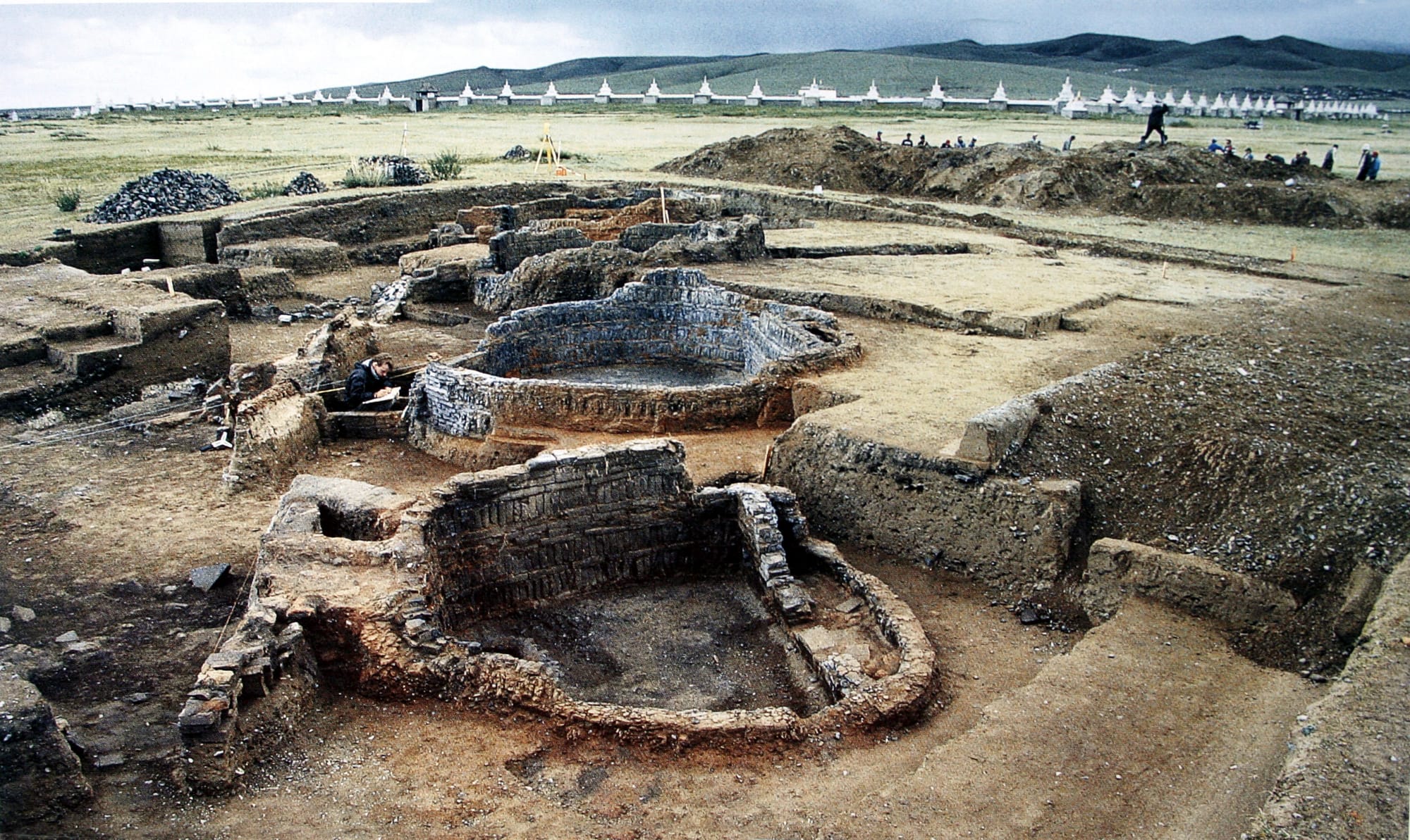 В конце XIX в. А.И. Позднеев на основе анализа многочисленных письменных источников подтвердил предположение Н.М. Ядринцева о местонахождении Каракорума на берегах реки Орхон. В 1948–1949 гг. специальная археологическая экспедиция советских и монгольских ученых под руководством член-корр. АН СССР С.В. Киселёвым окончательно решила о том, что найденные развалины принадлежат столице чингизидов – Каракоруму. Раскопки обнаружили квартал ремесленников, специализирующийся на металлургическом производстве оружия и снаряжения для армии, были обнаружены бронзовые втулки для боевых колесниц. В ремесленных кварталах были обнаружены кузнечные и железообрабатывающие мастерские с десятью печами для выплавки металла, обнаружено чугунолитейное производство, на котором для нужд армии изготавливались втулки (цуны) телег и повозок, внешним диаметром до 9 см. К востоку от города, по мнению ученых, располагались пашни с орошаемыми каналами. Были также найдены египетские статуэтки, что свидетельствует о торговых связях с дальними странами и сельскохозяйственные инструменты. Несмотря на то, что город жил главным образом привозным хлебом и рисом, его окружали обширные, хорошо орошаемые с помощью каналов, земледельческие пашни[1]. Археологическая экспедиция Киселёва обнаружила многочисленные остатки буддийского искусства, которые трудно было игнорировать, они не вполне соответствовали представлению о ханском дворце, особенно обнаруженные ими остатки до дворцового буддийского святилища под дворцовым подиумом.