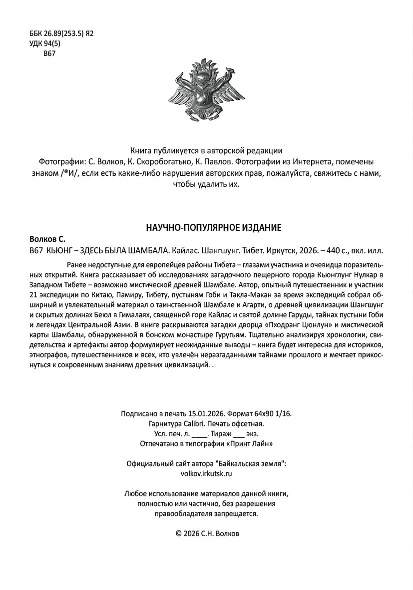 Сдана в печать новая книга Сергей Волков "Здесь была Шамбала. Древний Шангшунг. Кайлас и долина Гаруды", Иркутск, 2026 г. - 468 с. Желающие могут заказать у меня печатную версию с цветной вкладкой 16 стр или полностью полноцветный PDF