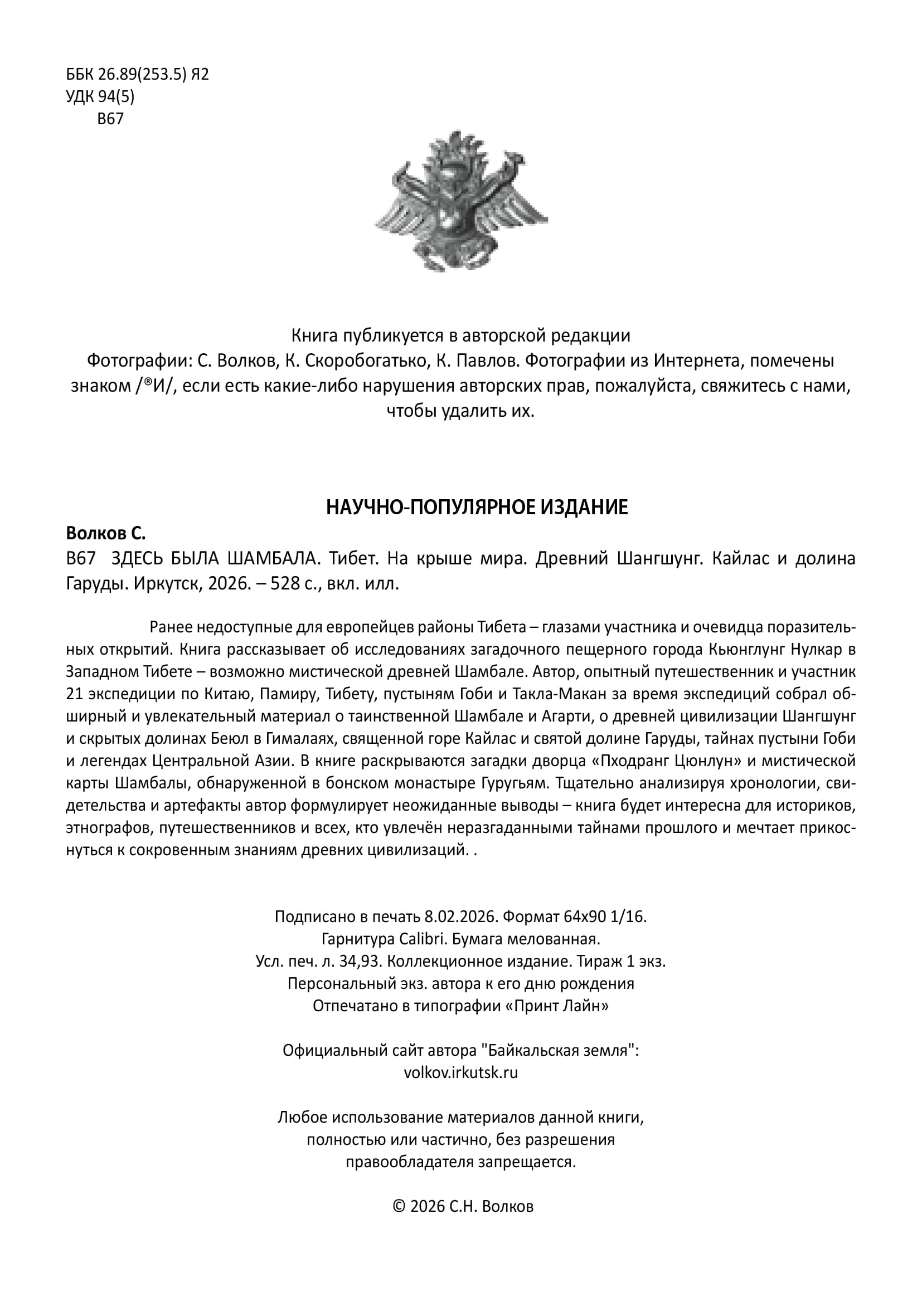 Вышла в свет 4-е дополненное издание, новая книга Сергей Волков "Здесь была Шамбала. Древний Шангшунг. Кайлас и долина Гаруды. Тибет. На крыше мира", Иркутск, 2026 г. - 416 с. Желающие могут заказать через Авито или у меня книгу - 416 стр. с ч/б иллюстрациями или полноцветный PDF - 528 с.
