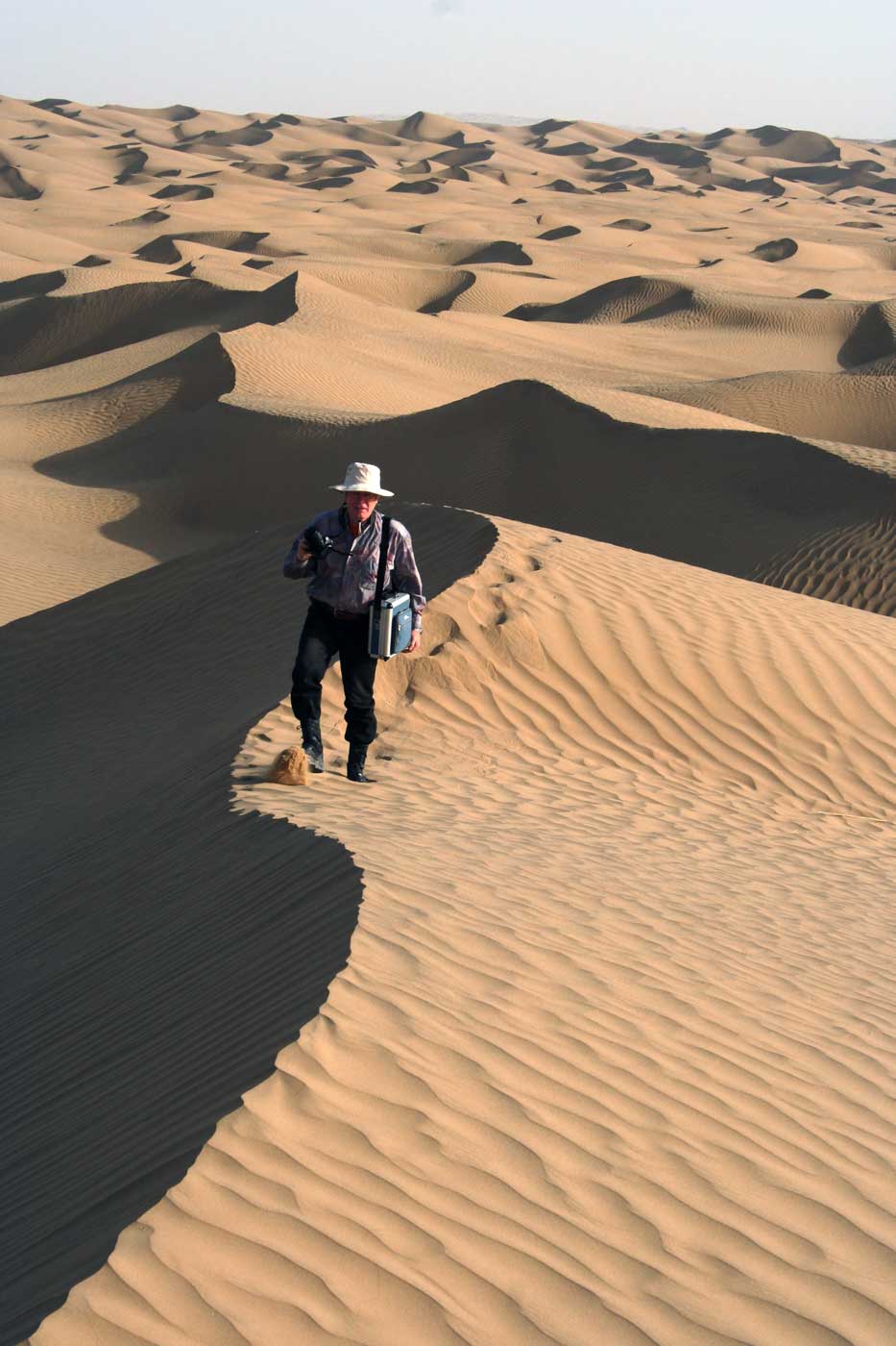 Мы едим по его маршруту путешествия. Начинается пустынный ландшафт. Протяженные зеленые оазисы, и возделанные поля, уступают место песчаной поверхности, местами покрытой выступившей солью. Из-за жары над дорогой висит марево, и сначала вдали на ней появляется, оторванное от земли большие призрачные видения – миражи, и только при приближении угадываются контуры автомобиля. Мираж автобуса можно принять за «Боинг», а идущего человека – за верблюда. Над пустыней висит молочная пелена, отчетливо видны передвигающие песчаные смерчи. Время для поездки в пустыню не самое привлекательное – весной время постоянных песчаных бурь и синего неба можно не увидеть. Пейзаж выдержан в строгих серых красках. Остается только завидовать прекрасным осенним фотографиям, снятыми фотографами в пустыне Такла-Макан, когда устанавливается устойчивая осенняя погода – синее небо, золотистые барханы и наполовину засохшие ветвистые тополя с пожелтевшей листвой. Ничего подобного мы сейчас не наблюдаем из-за сильного ветра и обилия пыли я даже не достаю свою фотоаппаратуру.