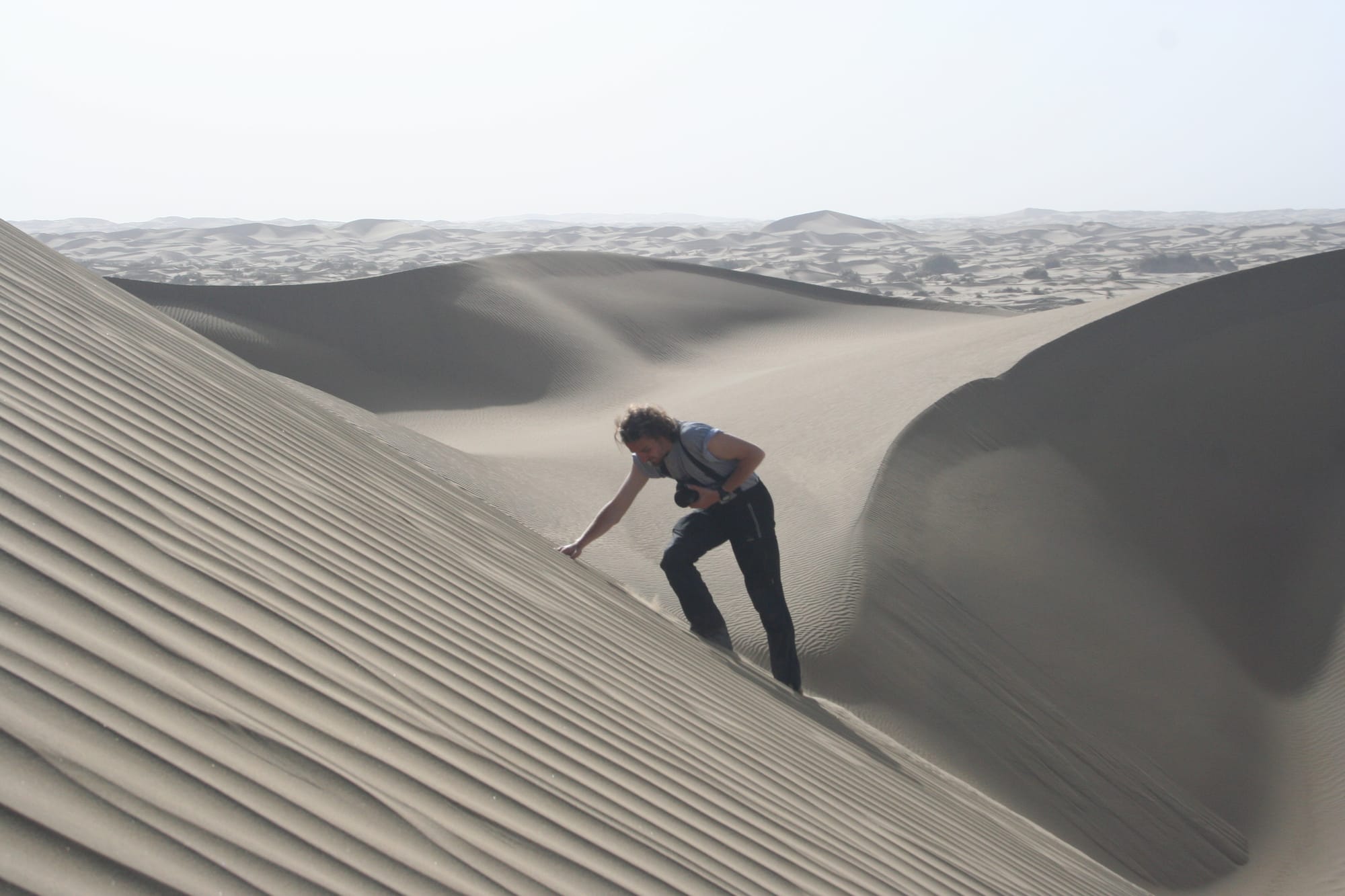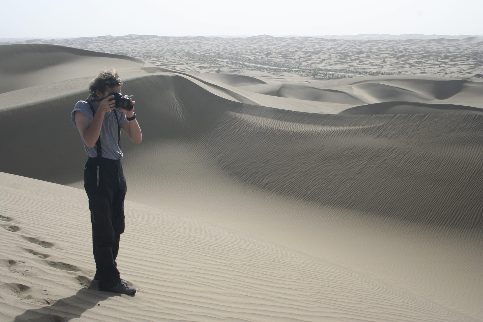 Мы едим по его маршруту путешествия. Начинается пустынный ландшафт. Протяженные зеленые оазисы, и возделанные поля, уступают место песчаной поверхности, местами покрытой выступившей солью. Из-за жары над дорогой висит марево, и сначала вдали на ней появляется, оторванное от земли большие призрачные видения – миражи, и только при приближении угадываются контуры автомобиля. Мираж автобуса можно принять за «Боинг», а идущего человека – за верблюда. Над пустыней висит молочная пелена, отчетливо видны передвигающие песчаные смерчи. Время для поездки в пустыню не самое привлекательное – весной время постоянных песчаных бурь и синего неба можно не увидеть. Пейзаж выдержан в строгих серых красках. Остается только завидовать прекрасным осенним фотографиям, снятыми фотографами в пустыне Такла-Макан, когда устанавливается устойчивая осенняя погода – синее небо, золотистые барханы и наполовину засохшие ветвистые тополя с пожелтевшей листвой. Ничего подобного мы сейчас не наблюдаем из-за сильного ветра и обилия пыли я даже не достаю свою фотоаппаратуру.