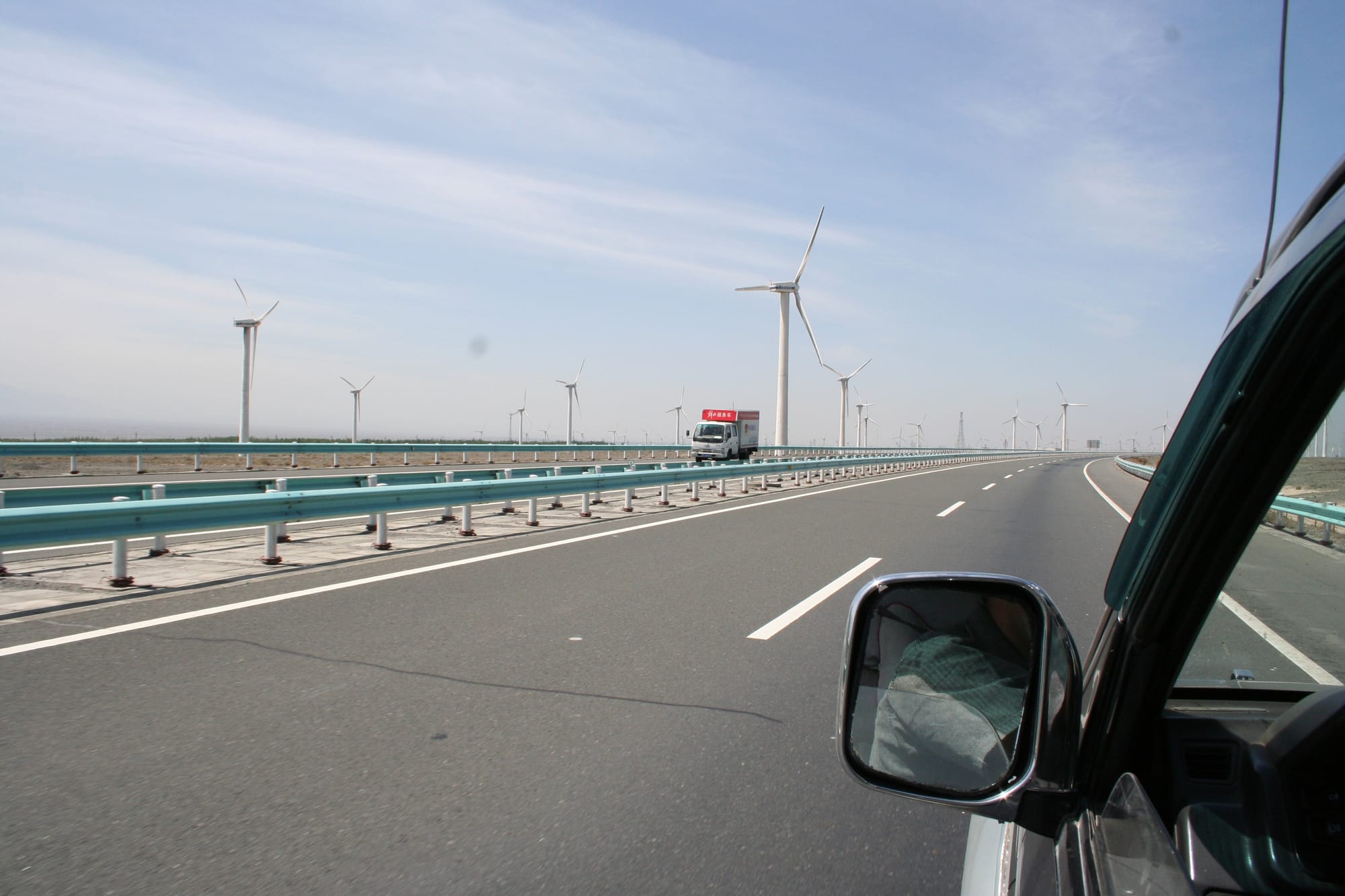По дороге к Турфану попадаем на шикарную платную дорогу со сплошным ограждением, идеальным покрытием и ограничительными знаками скорости 120 км/ч. По обочинам ветряные станции.