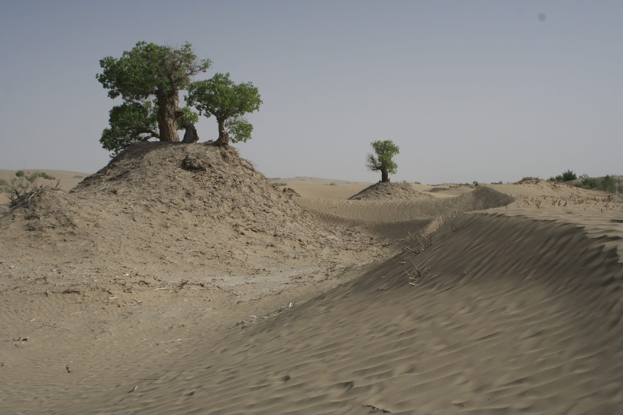 Сейчас типовые, синие домики смотрителей с цистерной на сваях и насосной станцией располагаются строго через 5–6 км пути. Порядковые номера указывают, что таких станций вдоль шоссе 120. С каждой стороны дороги на земле уложено по 20 шлангов с отверстиями для искусственного орошения. Отверстия совпадают с посаженными кустами тамариска, и иногда мы видим влажные пятна точно под зеленеющими кустами. Борьба за выживание растений в совершенно безводной местности ведется и вручную. Несколько раз мы видим китайцев, поливающих растения из ранцевых распылителей воды. Отвоеванная людьми у песков полоска асфальта и зеленая поросль с цветущими кустами тамариска на обочинах уходит за горизонт в марево песчаных барханов. Некоторые из них кажутся издалека настоящими исполинами, высота от подножия достигает сотни метров. Барханные пески занимают огромную площадь, на их пересечение – это около 570 км у нас уходит весь световой день. В центре пустыни пески совершенно безжизненны и, если подняться на высокий бархан, картина песчаной, безбрежной пустыни, в самом деле, напоминает бушующее море, где вместо волн застывшие песчаные барханы. Ближе к краям пустыни начинают встречаться одиночные засушенные тополя, а потом и живые рощи. Ветвистые деревья среди песков иногда выглядят очень выразительно, и фотографы любят снимать эти деревья осенью, когда пожелтеет листва и будет гарантированное синее небо. Сейчас, в мае – атмосфера наполнена поднятой пылью от постоянных весенних пылевых бурь и снимать при рассеянном полуденном солнце в такой дымке пейзажи невозможно. По окраинам пустыни и долинам рек встречаются тополь (туранга), лох, верблюжья колючка, однолетние солянки, саксаул. После 12 часов дня задул традиционный для этого времени года ветер. Видимость и без того плохая резко ухудшилась, песок заструился через асфальт поперек дороги, даже закрытые окна машины не защищают от песчаной пыли. Как следствие сухой кашель и въедливая грязь на руках, вся одежда пропитана сухой пылью и одно желание – вымыться и найти местечко без ветра и пыли. Но таких мест здесь просто нет.
