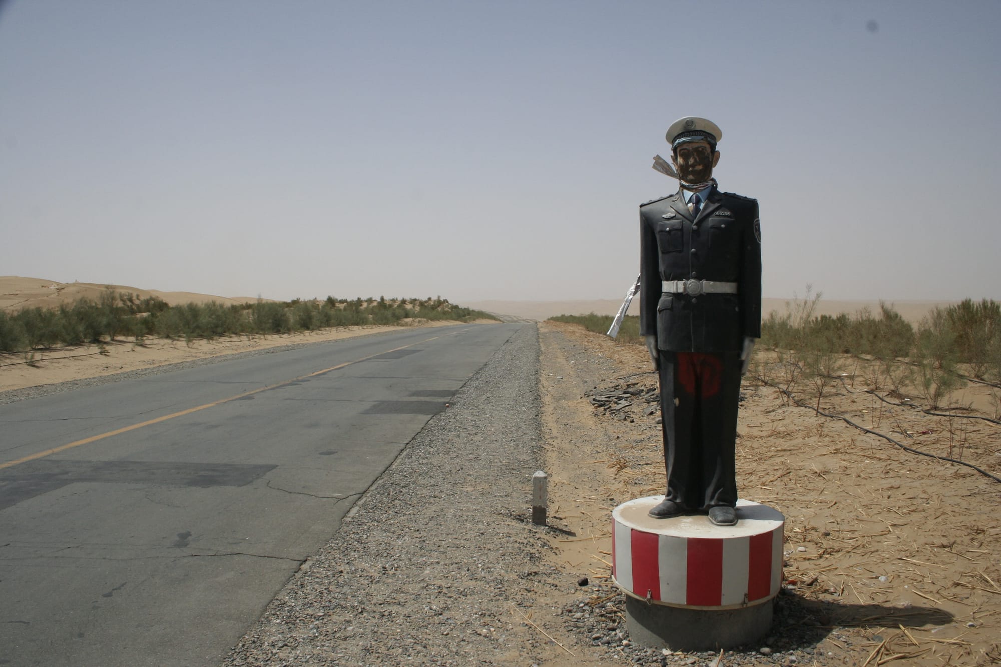 Для водителя дорога утомительна – абсолютно прямая с ровным асфальтом и однообразным пейзажем, есть все предпосылки заснуть за рулем. Может быть, специально для разнообразия на обочинах дороги в пустыне китайцы поставили манекены полицейских. Уже издалека видно, что это раскрашенная кукла. Об этом знают водители и пассажиры, но их присутствие как напоминание о дисциплине за рулем, своеобразный дорожный знак.