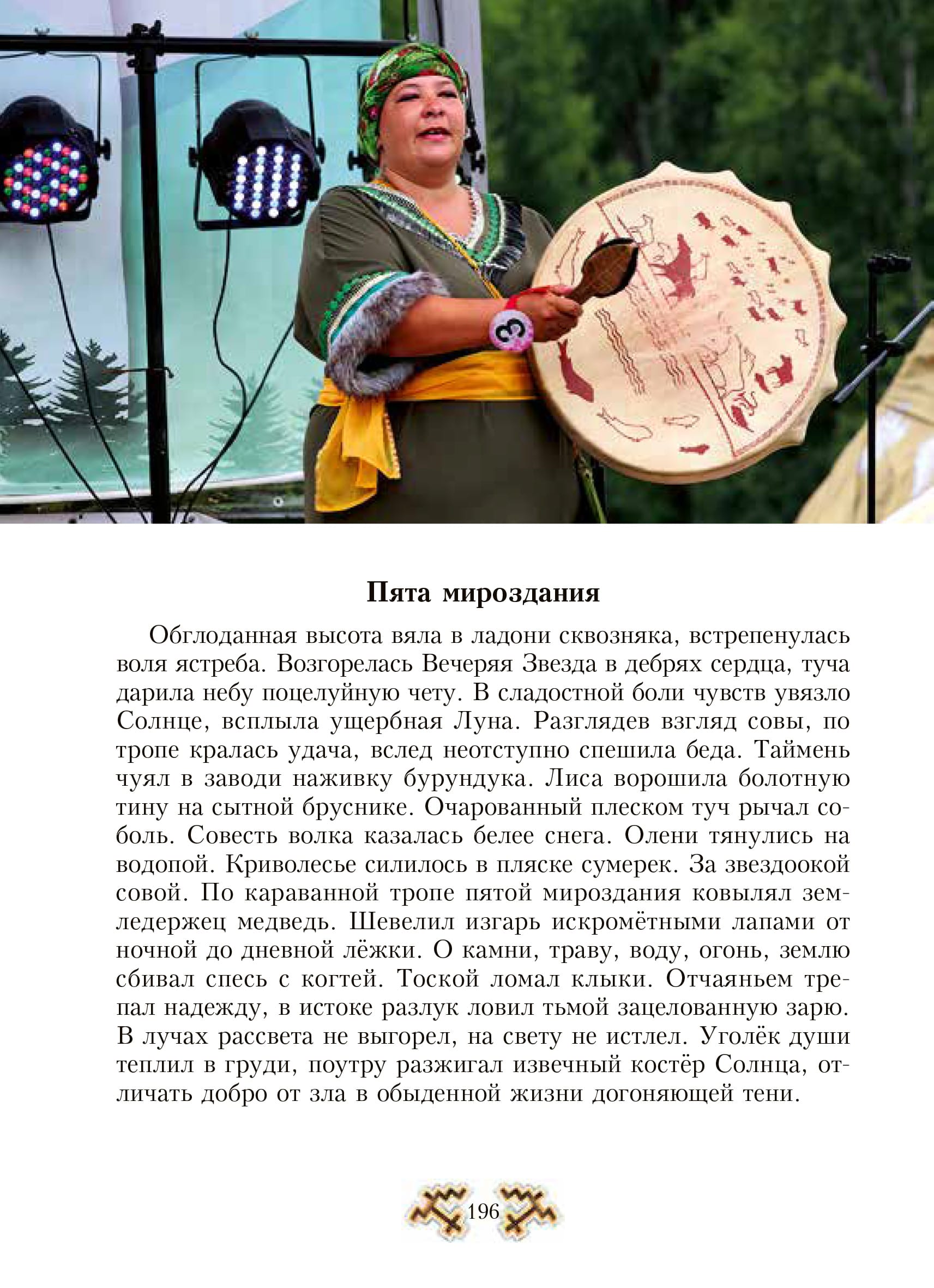 Тропа небылица У оленя была заветная мечта и чувства воплотить сон в жизнь. Жаждал увидеть мир, но не мог покинуть пределы горной цепи. На краю вечности, добывал иллюзии на мнимой тропе, Луна состарилась, изображая грёзы из мерцания звёзд. Рассветная заря погасила путеводные светила. Созидал надежды из утренних лучей в указующий проход. Солнце закрыла туча, олень потерял колею, запечатлел волю. Метель засыпала следы, олень не оробел, рогами высекал миражи из облаков. Пурга воровала воображение, от видений ссутулив загривок, берег страсть к странствиям. Неверный поворот заводил в опасности. Кружил вихрь, олень не отдал ожидание, туман пустил гулять на простор, себе оставил воплощение. В бездне лабиринтов не прекратил борьбу, встал на Млечную стезю, узнал вымыслы из звездопада. В оттепель снег подтаял и замёрз в наст. Олень грыз выдумки из ягеля под сугробом. Кусал лёд, терял цель, домыслы складывал из первоцветов на проталинах. На лазейке смыслов обдумывал шаги, взор обратил в реальность. Менял ориентиры и натиск ветер, олень устремлял стопы правды ввысь. Кочевал за желанием сердца по жизненному пути, в котором душа затаила почти растраченное вдохновение. /с. 17, "Озарение светом"/