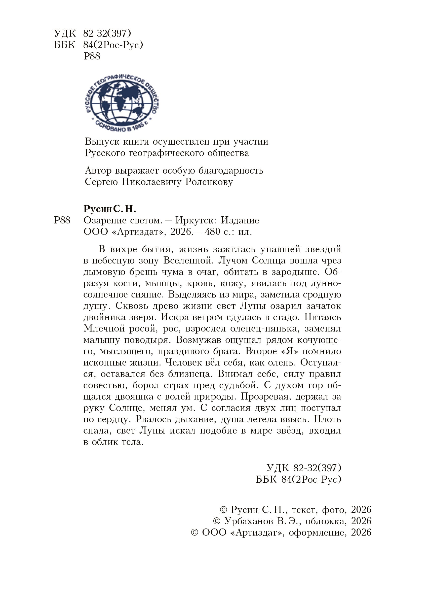 Русин С. Н. Озарение светом.—Иркутск: Издание ООО «Артиздат», апрель 2026.—480 с.: ил. Тираж 200 экз. Иллюстрированное полноцветное издание. Выпуск книги осуществлен при участии Русского географического общества.
