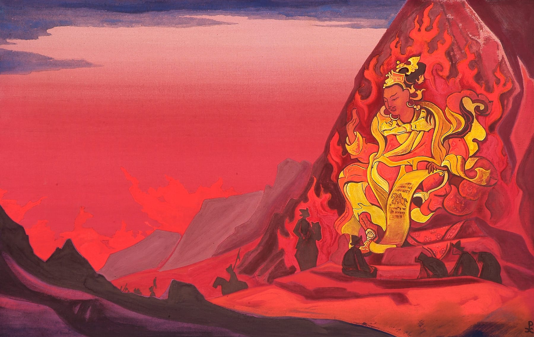 У буддийских верующих было распространенно предсказание о появлении с севера предводителя Шамбалы, рожденного в западном теле белого человека. Здесь очень кстати пришлась легенда о Шамбале, мифической, чистой земли буддистов, расположенной где-то к северу от Тибета. Н. Рерих способствует распространению легенды, что он как раз и является, перевоплощением далай-ламы V – 25-ым Владыкой северной Шамбалы. Он сам творит легенду, приближая сроки Шамбалы. В публикациях китаеведа Б.И. Иванова, встречавшегося с Н.К. Рерихом в 1927–1928 гг. говорится: «Художник (Н. Рерих) хотел въехать в Тибет как 25-й князь Шамбалы, о котором говорили, что он приедет с севера, принесет спасение всему миру и станет царем света. Носил он по этому случаю парадное ламское одеяние»[11].