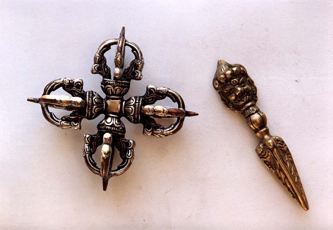 На тибетских тханках свастика изображается иногда в центре рисунка рядом с ваджрой (по тиб. – дордже), символом духовного могущества и божественного оружия, или по периметру с чередованием правосторонней и левосторонней свастик. Священники бон использовали знак свастики как магическое оружие величайшей силы. В тибетской мифологии распространен сюжет о падении магических предметов с неба, по мнению тибетцев произошли эти объекты из другого мира. В первую очередь к этим упавшим с неба объектам относится учение, заключенное в книге Чинтамани и магический жезл, золотой скипетр «Дордже» в отдаленные времена упавший с неба около монастыря Сера в Лхасе. Дордже состоит из короткой ручки и бутона лотоса на каждом конце, на бутоне лотоса покоится куб с изображением свастик на каждой грани. Дордже приписывают способность аккумулировать космические силы (владение небесным огнем) и метать молнии. Ваджра («молния», «алмаз») – в буддизме символ мгновенного, как вспышка молнии, просветления (бодхи). В иконографии буддизма изображается в виде двухстороннего пучка молний, исходящих из единой, круглой сферы. Особое развитие этот символ получил мифологии и ритуалах Ваджраяны. По энциклопедическому определению ваджра представляет собой стилизованное изображение боевой палицы (булавы) с заостренными навершием и отходящими от него острыми зубцами. Суммируя все определения, нетрудно заметить, что ваджра в первую очередь ассоциируется с оружием небывалой мощи, с оружием которое использовали боги, т.е. свастика, как и двойная ваджра связана с применением оружия.