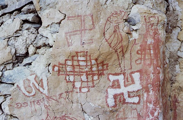 Изображение свастики имеют широкое распространение по всему Тибету с древних времен. На большом количестве наскальных рисунков часто присутствует знак свастики. Он встречается также на бонских печатях и в символике орнамента монастырей. Свастики выбиты на поверхности скал, на камнях вдоль троп, в уединенных местах, насыпаются в современных мандалах из цветного песка на поверхности земли. Нигде в мире не встречается так часто знак свастики, как в Тибете.