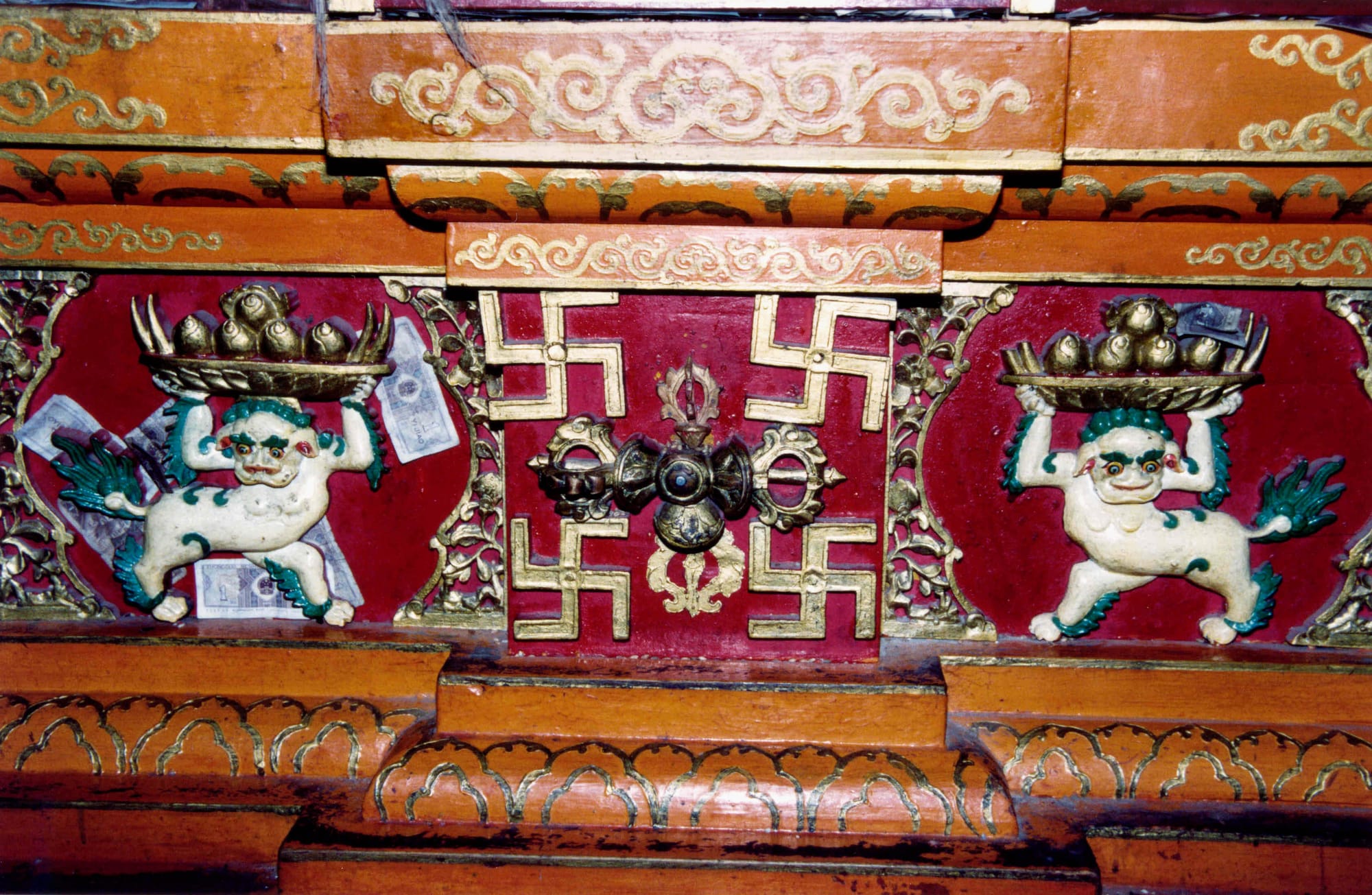 Свастика (санскрит: «благополучие») – один из самых известных, всемирно почитаемых, древних магических символов, считается самой мистической и древней диаграммой. В Индии с древних времен свастику рисуют всегда и везде, где требуется признать благословение божественных сил. В бонских проповедях говорят о свастике как о благой творческой силе просветления, пронизывающей все области мироздания. Сущность бона связана со свастикой. Само слово бон происходит от юн-друнг-бон, что означает «проговаривать магические заклинания», или «повторять секретные формулы».. По утверждению немецкого профессора-индолога М. Мюллера правосторонняя свастика соответствует весеннему, прибывающему дню, а левосторонняя является символом летнего солнцестояния, с которого начинается убывания дня. Свастика с точками, круг с точкой и полумесяц – это звездное небо над землёй, солнце и луна. Свастика без точек – это нерушимая и вечная земля. Свастика на груди Учителей, отличительный знак сыновей Бога, отражение их небесного происхождения. Знак свастики на земле – знак святости местности.