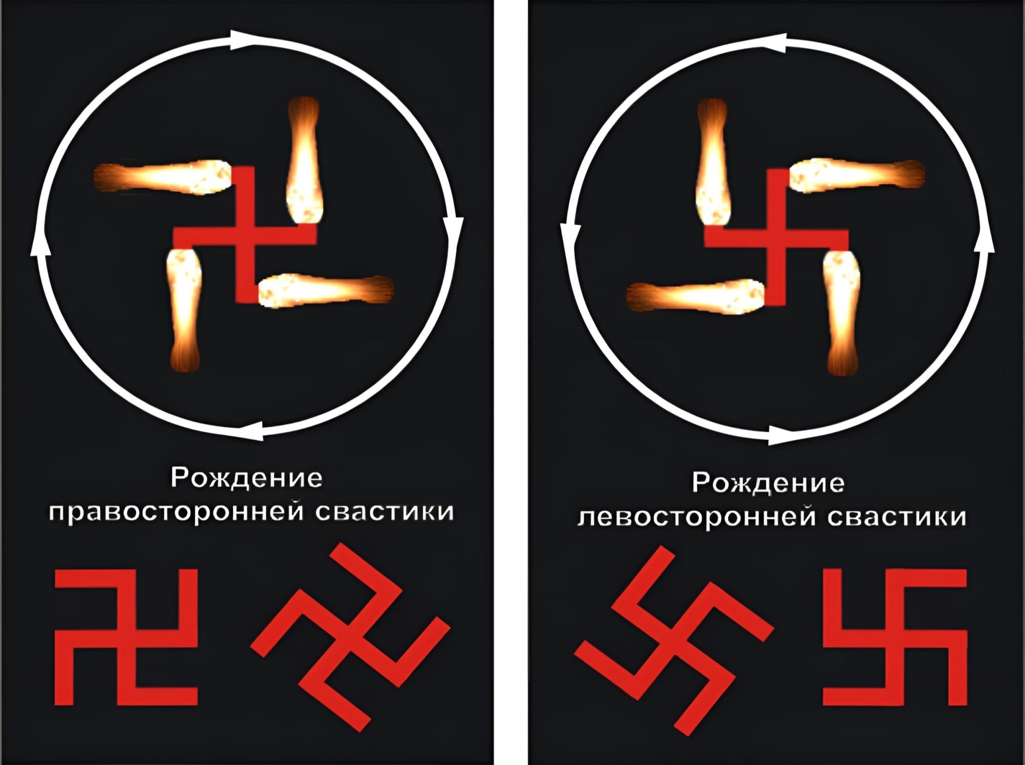 Правосторонняя свастика (направление вращения: по часовой стрелке – движение солнца по небу в Северном полушарии, концы свастики направлены влево) – символ изначального духовного центра, путь правой руки: означает естественное начало, естественный ход вещей, Солнце, свет, жизнь, процветание, удачу, движение вперёд.
