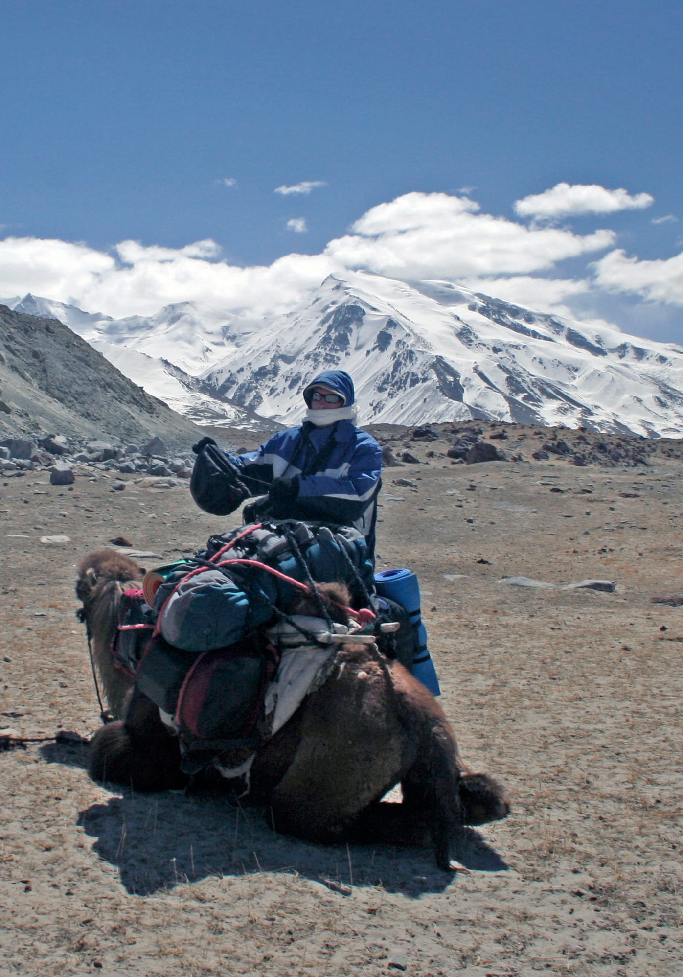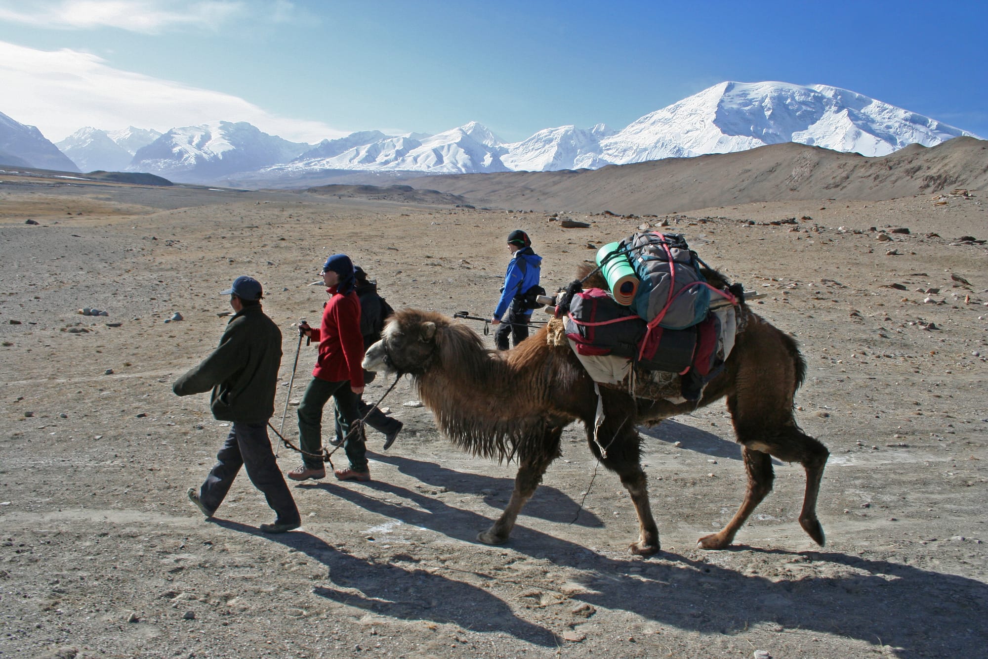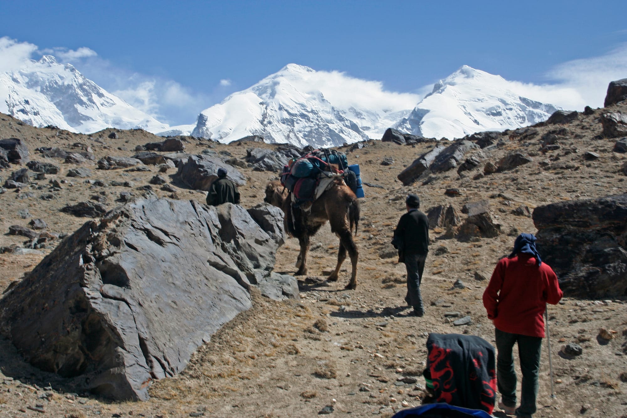 От озера Караколя мы поднимаемся к леднику Конгура. Навьюченный верблюд легко поднимает три наших больших рюкзака
