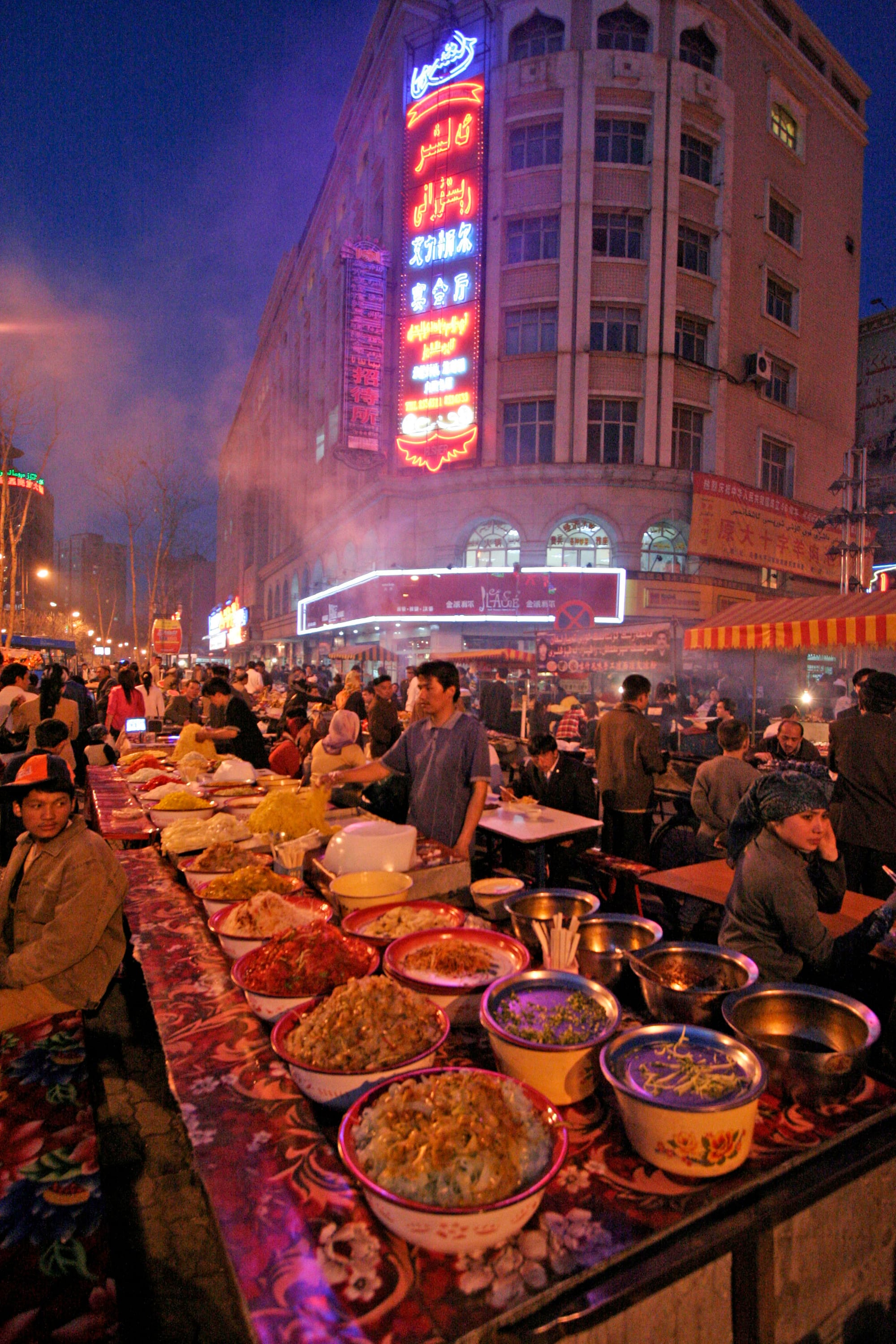 Улицы Урумчи поражают красками непрерывного, восточного базара, кажется весь город один сплошной рынок. В центре для пешеходов нет привычного европейского, свободного тротуара, все пространство с утра до поздней ночи плотно заставлены передвижными тележками продавцов. Здесь и фрукты, и мясо, и лепешки, здесь же столики для еды. Двигающиеся автомобили и пешеходы мирно соседствуют с рядами аппетитных фруктовых тележек. Уйгурские бородатые продавцы в белых халатах, соревнуясь в привлечении покупателей, украшают свои лотки фигурно нарезанными дольками ананасов и спелыми кусочками арбуза. Вечером фруктовые лотки освещаются мощными электрическими лампочками и смотрятся среди окружающей темноты как на картинах импрессионистов. Очень трудно удержаться от соблазна и не попробовать гранатового сока, отжимаемого на твоих глазах, или экзотического, спелого плода манго. Цены по сравнению с российскими на несколько порядков ниже, в 2006 году составляли: килограмм гранат – 35 р, стакан гранатового сока – 6 р, шашлык с пятью кусочками зажаренной баранины – 3,5 р, блюдо из 10 небольших поз – 12 р.
