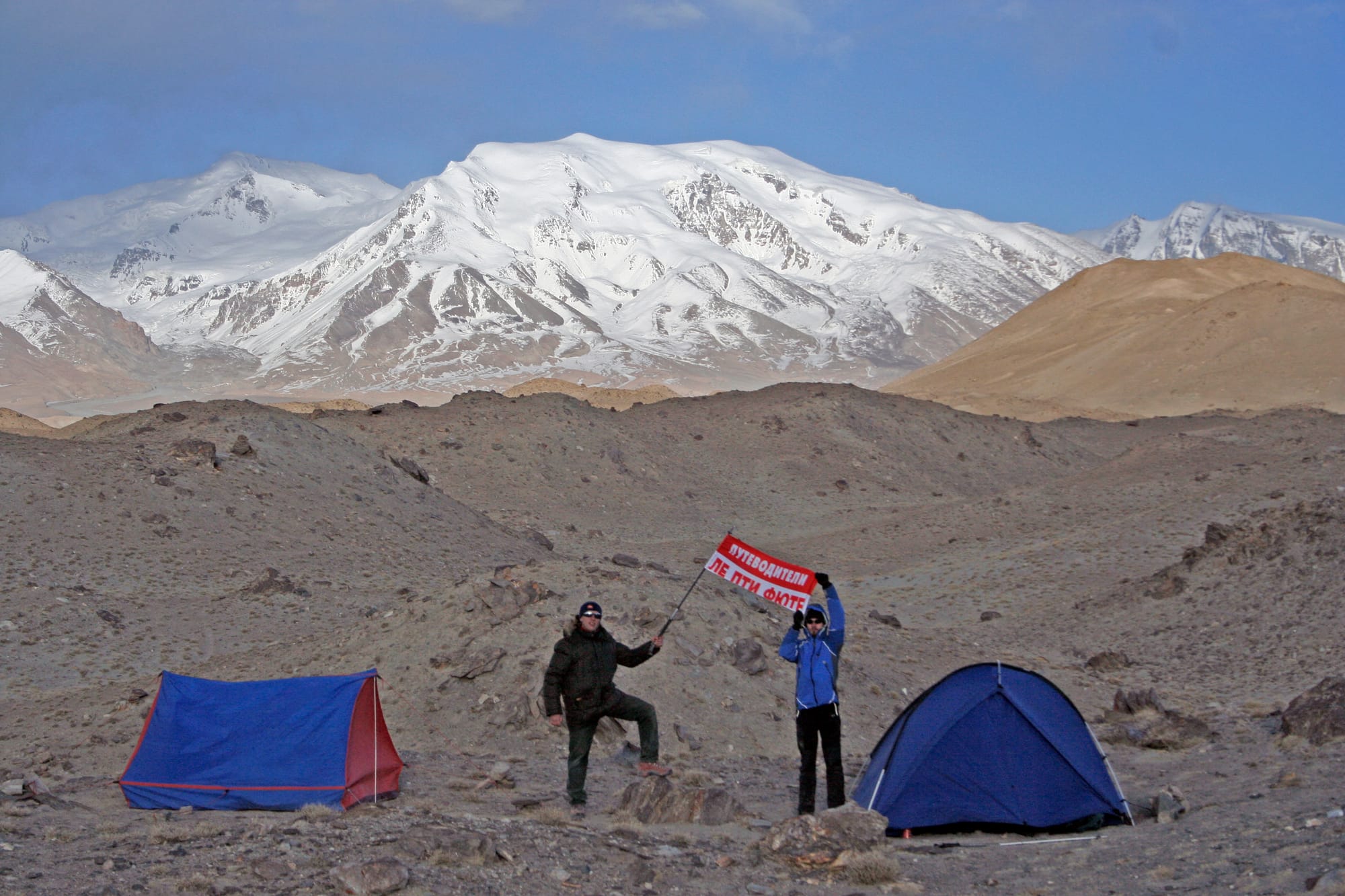 Устанавливать палатки нам мешает сильный ветер, он сильно раздувает брезент и пронизывает холодом сквозь всю одежду. Приходится надевать на себя все теплые вещи. Первая ночевка на 3650 м проходит под страшным ветром, спать при таком хлопанье брезента, очень трудно. У меня одноместная, легкая палатка, которая буквально разрывается от ветра и трижды за ночь мне приходится вылезать из спальника, а затем из палатки, чтобы заново крепить сорванные ветром стояки, легкие и изящные телескопические стойки оказываются непригодными для горных условий и не выдерживают напора стихии. Кроме того, очень холодно, температура падает до минус 13 градусов. К утру внутри палатки на тенте образовалась тонкая ледяная корка, изо рта идет пар, а вода, оставленная в котелках на улице, полностью замерзает. Над Музтагатой утром клубятся облака и полностью скрывают ее вершину.
