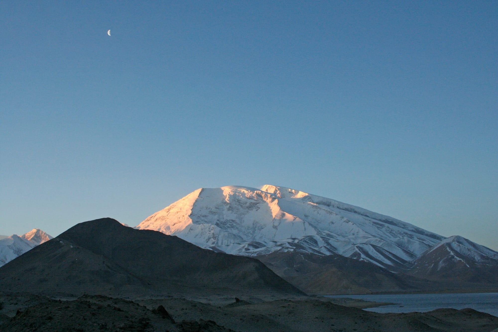 До ледника Конгура от озера Караколь около 20 км, наверное, можно их пройти и самостоятельно, но мы толком не знаем направления и тропы. К тому же нас настойчиво осаждают хозяева лошадей и верблюдов, наперебой предлагая свои услуги для перевозки наших рюкзаков. Проводник с вьючной лошадью под наши три рюкзака просит 300 юаней. Немного поторговавшись, окончательно сговариваемся на 150 юаней. Идти в этот вечер сразу к подножию Конгура мы не хотим и решаем ночевать в палатках на берегу озера. Проводник с вьючным верблюдом должен забрать нас завтра из нашего базового лагеря. Для ночевки в палатках мы выбрали одну из вершин близлежащих холмов, откуда открывался замечательный вид на озеро. Над снежной шапкой Музтагаты серебрится молодой полумесяц и даже ночью видно, как светится от лунного света снег на ее вершине.