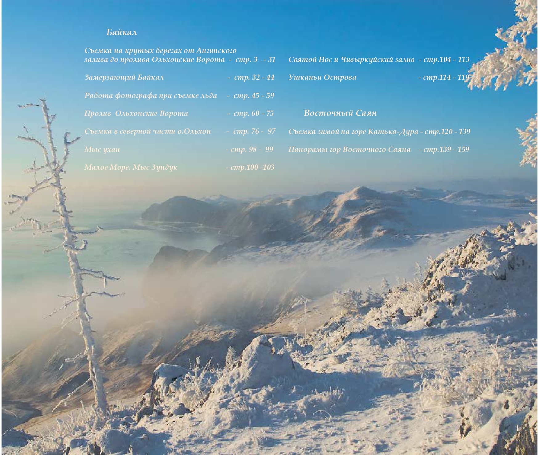 В этот альбом вошли фотографии, сделаные на озере Бай кал и горах Восточного Саяна в течение многих лет. Съемки проводились в разное время года. Иногда в сложных погодных условиях и труднодоступных местах, где фотографы появ ляются редко или их вообще не бывает. В альбоме, кроме снимков, есть небольшие пояснения к съемкам наиболее сложных кадров и небольшие описания интересных мест. Альбом художественной фотографии не учебник и не посо бие, но начинающие фотографы наверняка найдут для себя что-то полезное. Здесь профессия фотограф будет раскры ваться на примере съемок в сложных для работы условиях.