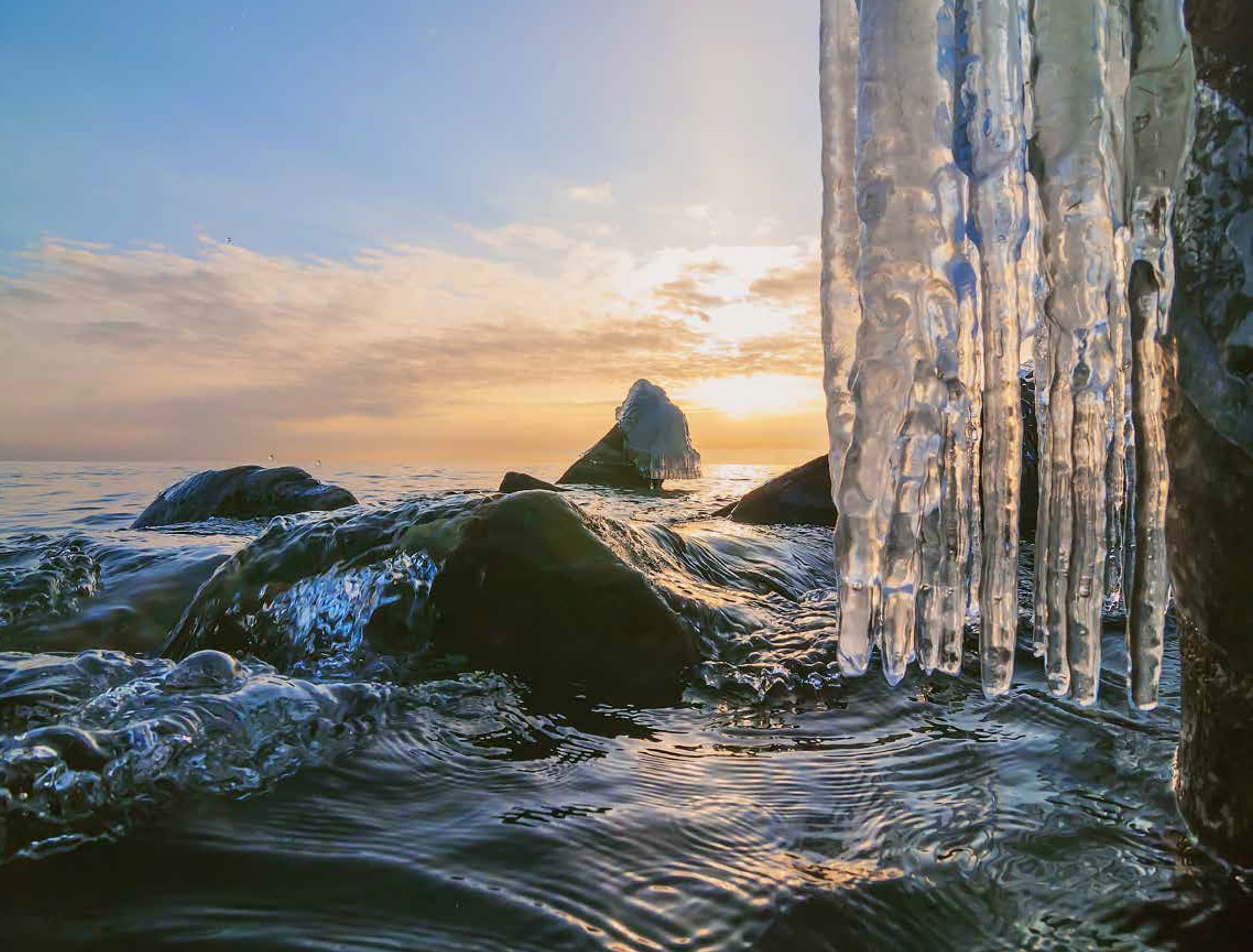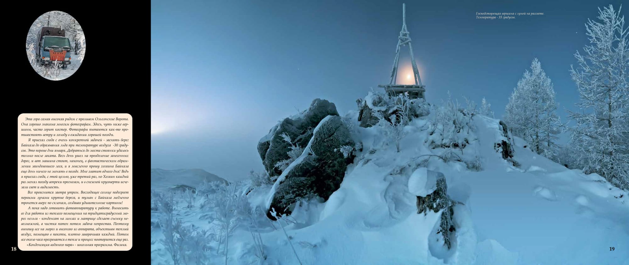 Эта гора самая высокая рядом с проливом Ольхонские Ворота. Она хорошо знакома многим фотографам. Здесь, чуть ниже вер шины, часто горит костер. Фотографы пытаются как-то про тивостоять ветру и холоду в ожидании хорошей погоды. Я приехал сюда с очень конкретной задачей - заснять берег Байкала до образования льда при температуре воздуха -30 граду сов. Это первые дни января. Добраться до места стоянки удалось только после заката. Весь день ушел на преодоление занесенных дорог, и вот машина стоит, наконец, в фантастическом обрам лении заиндевевшего леса, и я мысленно прошу хозяина Байкала еще день ничего не менять в погоде. Мне хватит одного дня! Ведь я приехал сюда, с этой целью, уже третий раз, но Хозяин каждый раз менял погоду вопреки прогнозам, и в снежной круговерти исче зали свет и видимость. Все прояснится завтра утром. Восходящее солнце подогреет первыми лучами крутые берега, и туман с Байкала медленно тронется вверх по склонам, создавая удивительные картины! А пока надо готовить фотоаппаратуру к работе. Выносить ее для работы из теплого помещения на тридцатиградусный мороз нельзя - конденсат на линзах и матрице сделает съемку не возможной, а чистка пятен потом задача непростая. Поэтому выношу все на мороз и выгоняю из аппарата, объективов теплый воздух, помещаю в пакеты, плотно заворачивая каждый. Потом все около часа прогревается в тепле и процесс повторяется еще раз. «Конденсация водяного пара» - школьная программа.