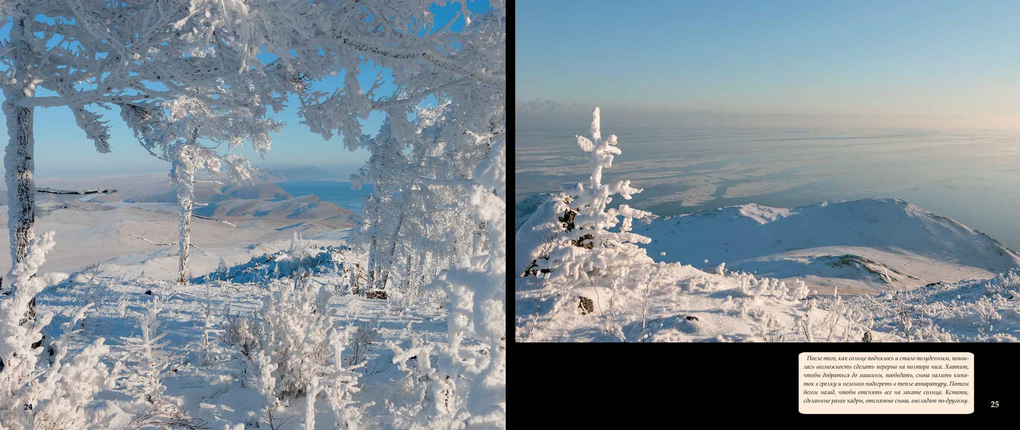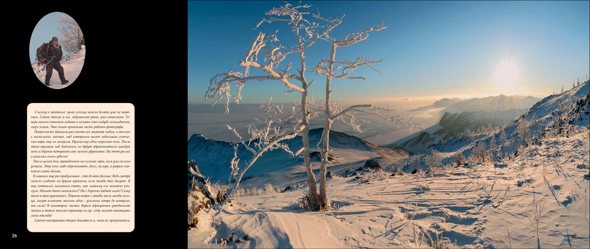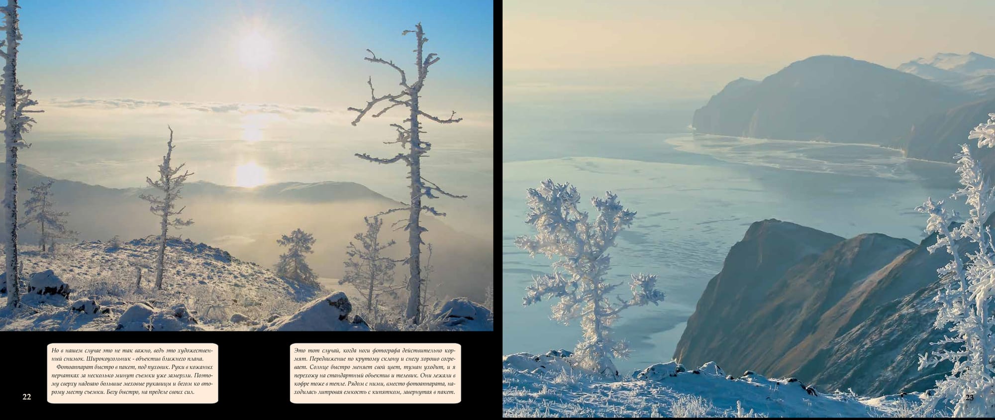 Уже полчаса стою у первого намеченного места съемки. Аппарат, завернутый в пакет, находится под пуховиком, который перетянут в поясе ремнем. Он в тепле, а плотный пакет защищает от испарений. Так можно работать весь день при любом морозе. На фотоаппарате стоит широкоугольник, включен ручной режим и точечный экспозамер.Солнце едва угадывается сквозь плотный туман, который уже начинает отрываться от поверхности. И, наконец-то, багровый диск пробивается. Делаю экспозамер по диску солнца и снимаю первый кадр. В котором главное - ближний план и солнце. Все, что находится на дальнем плане, уменьшилось в несколько раз и не соответствует действительности.Но в нашем случае это не так важно, ведь это художествен ный снимок. Широкоугольник - объектив ближнего плана. Фотоаппарат быстро в пакет, под пуховик. Руки в кожаных перчатках за несколько минут съемки уже замерзли. Поэто му сверху надеваю большие меховые рукавицы и бегом ко вто рому месту съемки. Бегу быстро, на пределе своих сил.Это тот случай, когда ноги фотографа действительно кормят. Передвижение по крутому склону и снегу хорошо согревает. Солнце быстро меняет свой цвет, туман уходит, и я перехожу на стандартный обьектив и телевик. Они лежали в кофре тоже в тепле. Рядом с ними, вместо фотоаппарата, на ходилась литровая емкость с кипятком, завернутая в пакетПосле того, как солнце поднялось и стало полуденным, появилась возможность сделать перерыв на полтора часа. Хватит, чтобы добраться до машины, пообедать, снова налить кипя ток в грелку и немного подогреть в тепле аппаратуру. Потом бегом назад, чтобы отснять все на закате солнца. Кстати, сделанные ранее кадры, отснятые снова, выглядят по-другому.Съемку в закатных лучах солнца можно делать уже не торопясь. Стало теплее и все, задуманное ранее, уже выполнено. Те перь можно спокойно ходить и искать что-нибудь неожиданное, сверх плана. Это самая приятная часть работы фотографа. Поверхность Байкала уже почти вся закрыта льдом, и только в нескольких местах, над которыми висят небольшие скопления пара, еще не замерзла. Нужна еще одна морозная ночь. После этого туманы над Байкалом не будут образовываться каждую ночь и деревья потеряют свое зимнее убранство. На этот раз все сложилось очень удачно! После целого дня, проведенного на склонах горы, ноги уже сильно устали. Эту ночь надо переночевать здесь, на горе, а утром спокойно ехать домой. В машине еще раз продумываю , что делать дальше. Ведь завтра можно сходить на другие вершины, если погода так балует. Я еще готовился ложиться спать, как машину еле заметно качнуло. Может быть показалось? Но с деревьев падает иней! Сижу тихо и прислушиваюсь. Порывы ветра с запада, после захода солнца, могут означать только одно - усиление ветра до штормовой силы! В некоторых частях дороги образуются грандиозные заносы и потом только трактор на гус. ходу может вытащить меня отсюда! Срочно настраиваю обогрев двигателя и, пока он прогревается,Машина двигается вдоль становой трещины, в ста метрах от нее. Лед весенний, непрочный. Близко к трещине подъезжать опасно. Нам надо найти проход на другую сторону. Далеко за трещиной стоит машина, значит, проход есть. Водителю в такой ситуации надо быть предельно внимательным. Наверное, за раз говорами, этого и не хватило. Черное пятно впереди оказывается проталиной, затянутой то