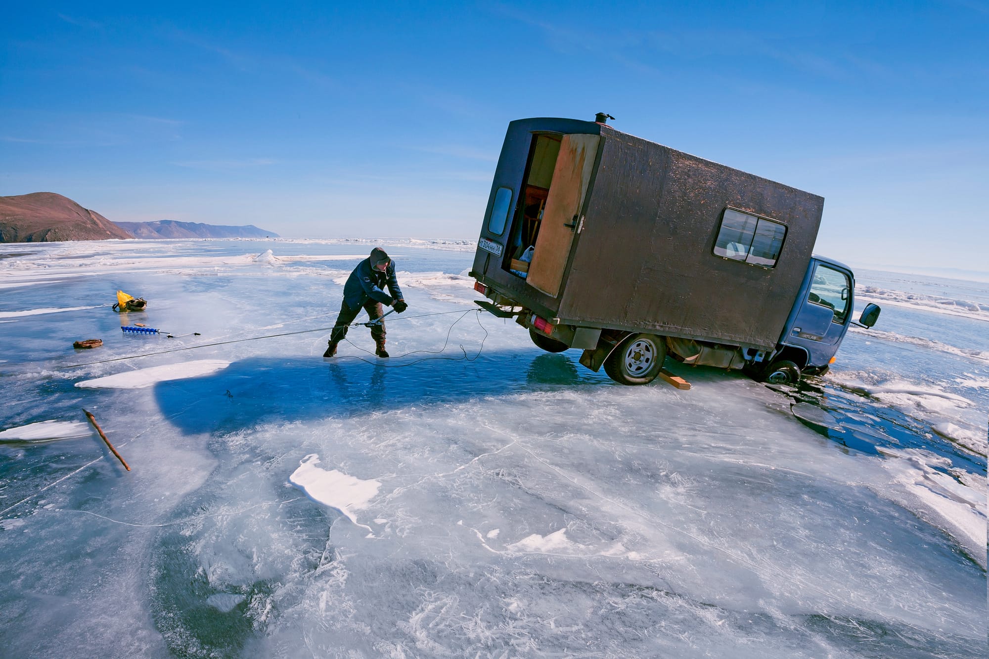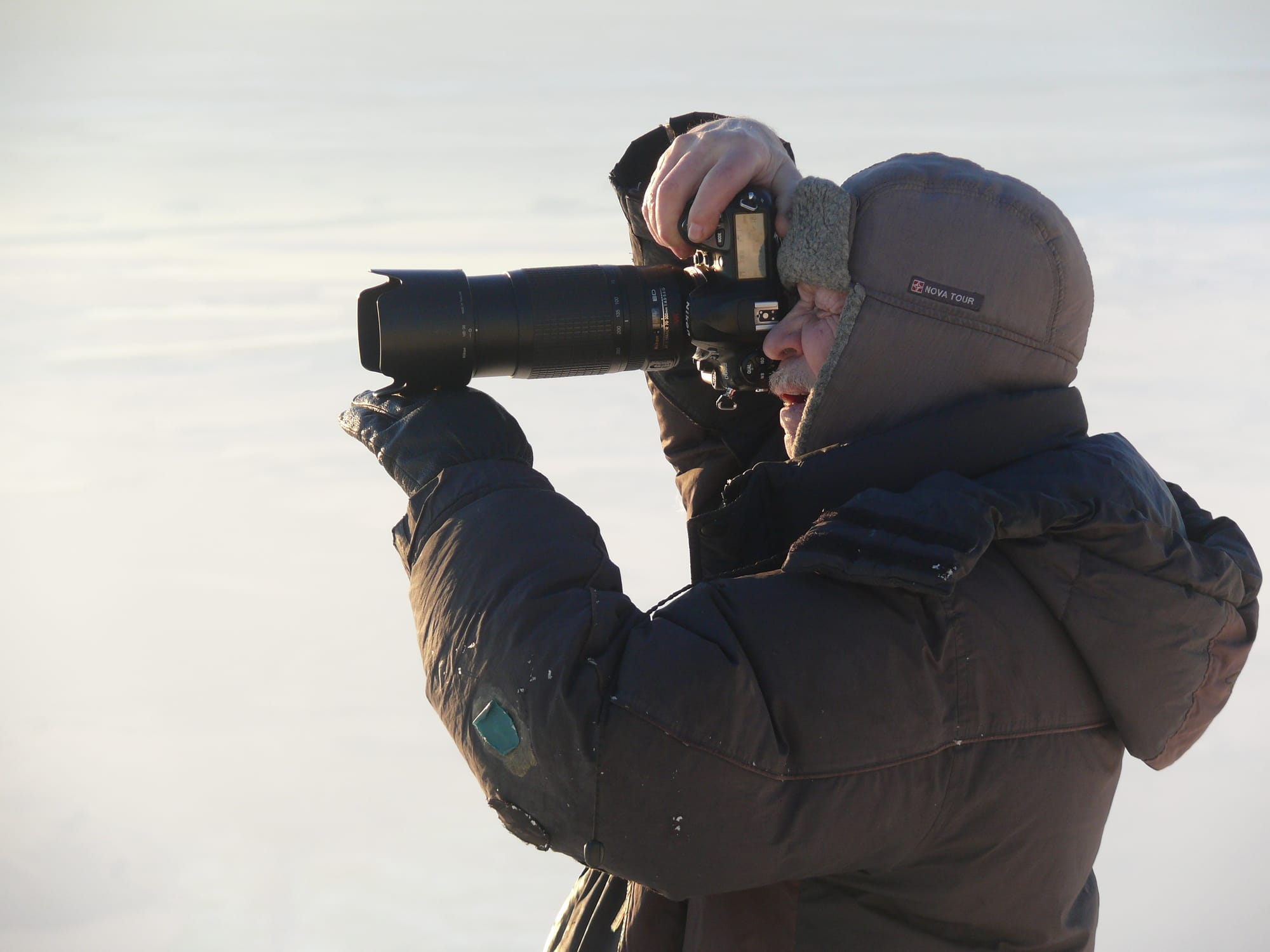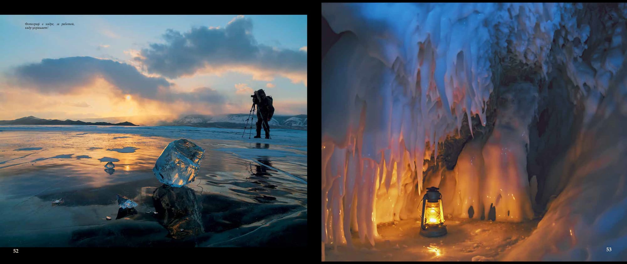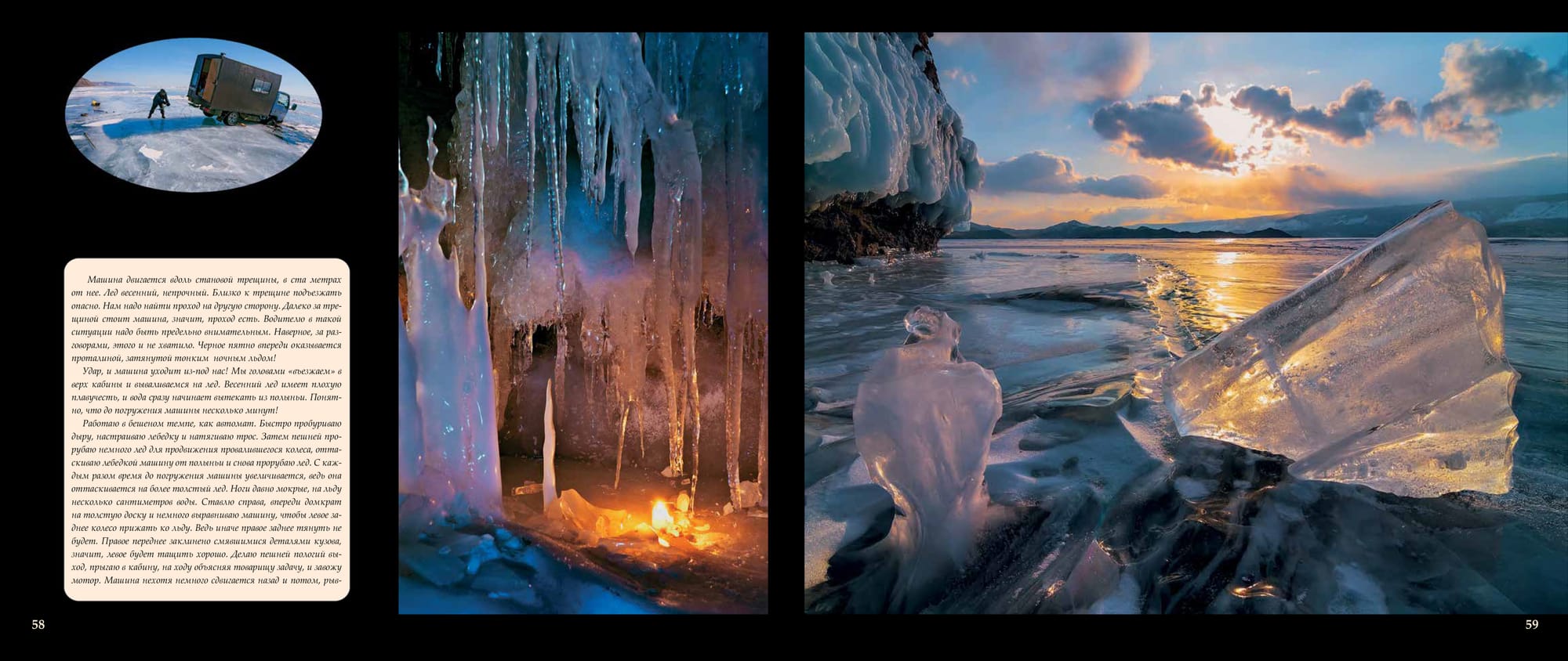 Уже полчаса стою у первого намеченного места съемки. Аппарат, завернутый в пакет, находится под пуховиком, который перетянут в поясе ремнем. Он в тепле, а плотный пакет защищает от испарений. Так можно работать весь день при любом морозе. На фотоаппарате стоит широкоугольник, включен ручной режим и точечный экспозамер.Солнце едва угадывается сквозь плотный туман, который уже начинает отрываться от поверхности. И, наконец-то, багровый диск пробивается. Делаю экспозамер по диску солнца и снимаю первый кадр. В котором главное - ближний план и солнце. Все, что находится на дальнем плане, уменьшилось в несколько раз и не соответствует действительности.Но в нашем случае это не так важно, ведь это художествен ный снимок. Широкоугольник - объектив ближнего плана. Фотоаппарат быстро в пакет, под пуховик. Руки в кожаных перчатках за несколько минут съемки уже замерзли. Поэто му сверху надеваю большие меховые рукавицы и бегом ко вто рому месту съемки. Бегу быстро, на пределе своих сил.Это тот случай, когда ноги фотографа действительно кормят. Передвижение по крутому склону и снегу хорошо согревает. Солнце быстро меняет свой цвет, туман уходит, и я перехожу на стандартный обьектив и телевик. Они лежали в кофре тоже в тепле. Рядом с ними, вместо фотоаппарата, на ходилась литровая емкость с кипятком, завернутая в пакетПосле того, как солнце поднялось и стало полуденным, появилась возможность сделать перерыв на полтора часа. Хватит, чтобы добраться до машины, пообедать, снова налить кипя ток в грелку и немного подогреть в тепле аппаратуру. Потом бегом назад, чтобы отснять все на закате солнца. Кстати, сделанные ранее кадры, отснятые снова, выглядят по-другому.Съемку в закатных лучах солнца можно делать уже не торопясь. Стало теплее и все, задуманное ранее, уже выполнено. Те перь можно спокойно ходить и искать что-нибудь неожиданное, сверх плана. Это самая приятная часть работы фотографа. Поверхность Байкала уже почти вся закрыта льдом, и только в нескольких местах, над которыми висят небольшие скопления пара, еще не замерзла. Нужна еще одна морозная ночь. После этого туманы над Байкалом не будут образовываться каждую ночь и деревья потеряют свое зимнее убранство. На этот раз все сложилось очень удачно! После целого дня, проведенного на склонах горы, ноги уже сильно устали. Эту ночь надо переночевать здесь, на горе, а утром спокойно ехать домой. В машине еще раз продумываю , что делать дальше. Ведь завтра можно сходить на другие вершины, если погода так балует. Я еще готовился ложиться спать, как машину еле заметно качнуло. Может быть показалось? Но с деревьев падает иней! Сижу тихо и прислушиваюсь. Порывы ветра с запада, после захода солнца, могут означать только одно - усиление ветра до штормовой силы! В некоторых частях дороги образуются грандиозные заносы и потом только трактор на гус. ходу может вытащить меня отсюда! Срочно настраиваю обогрев двигателя и, пока он прогревается,Машина двигается вдоль становой трещины, в ста метрах от нее. Лед весенний, непрочный. Близко к трещине подъезжать опасно. Нам надо найти проход на другую сторону. Далеко за трещиной стоит машина, значит, проход есть. Водителю в такой ситуации надо быть предельно внимательным. Наверное, за раз говорами, этого и не хватило. Черное пятно впереди оказывается проталиной, затянутой то